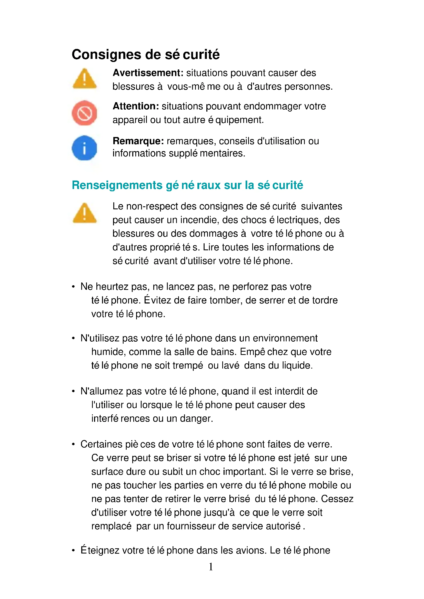 Le non-respect des consignes de sécurité suivantes peut causer un incendie, des chocs électriques, des blessures ou des dommages à votre téléphone ou à d'autres propriétés. Lire toutes les informations de sécurité avant d'utiliser votre téléphone.