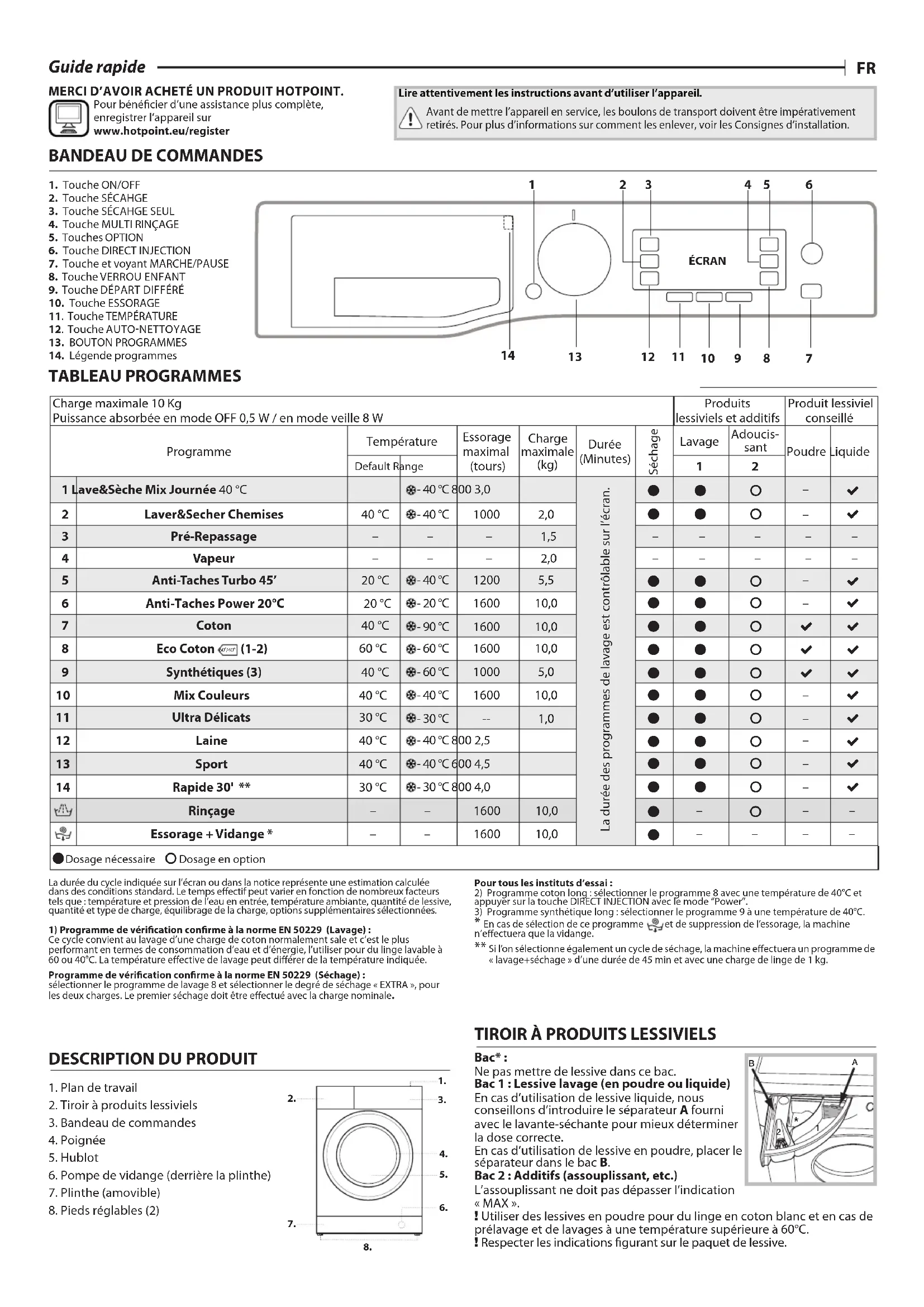 Guide rapide MERCI D’AVOIR ACHETÉ UN PRODUIT HOTPOINT. Pour bénécier d’une assistance plus complète, enregistrer l’appareil sur www.hotpoint.eu/register