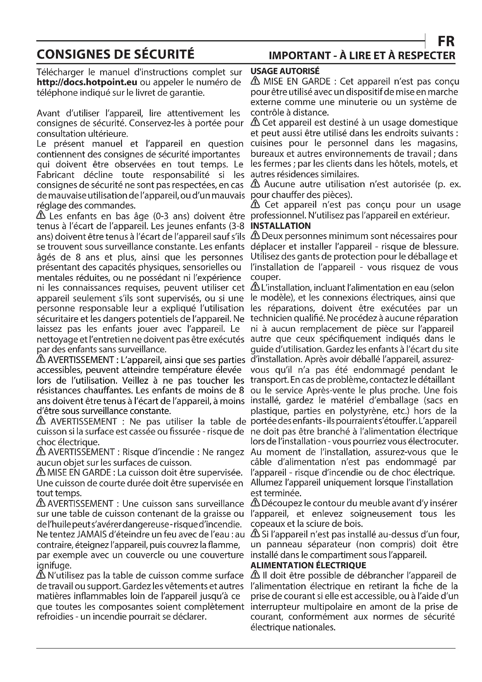 Télécharger le manuel d'instructions complet sur http:// docs.hotpoint.eu ou appeler le numéro de téléphone indiqué sur le livret de garantie. Avant d’utiliser l’appareil, lire attentivement les consignes de sécurité. Conservez-les à portée pour consultation ultérieure. Le présent manuel et l’appareil en question contiennent des consignes de sécurité importantes qui doivent être observées en tout temps. Le Fabricant décline toute responsabilité si les consignes de sécurité ne sont pas respectées, en cas de mauvaise utilisation de l’appareil, ou d’un mauvais réglage des commandes. Les enfants en bas âge (0-3 ans) doivent être tenus à l’écart de l’appareil. Les jeunes enfants (3-8 ans) doivent être tenus à l’écart de l’appareil sauf s’ils se trouvent sous surveillance constante. Les enfants âgés de 8 ans et plus, ainsi que les personnes présentant des capacités physiques, sensorielles ou mentales réduites, ou ne possédant ni l’expérience ni les connaissances requises, peuvent utiliser cet appareil seulement s’ils sont supervisés, ou si une personne responsable leur a expliqué l’utilisation sécuritaire et les dangers potentiels de l’appareil. Ne laissez pas les enfants jouer avec l’appareil. Le nettoyage et l’entretien ne doivent pas être exécutés par des enfants sans surveillance.