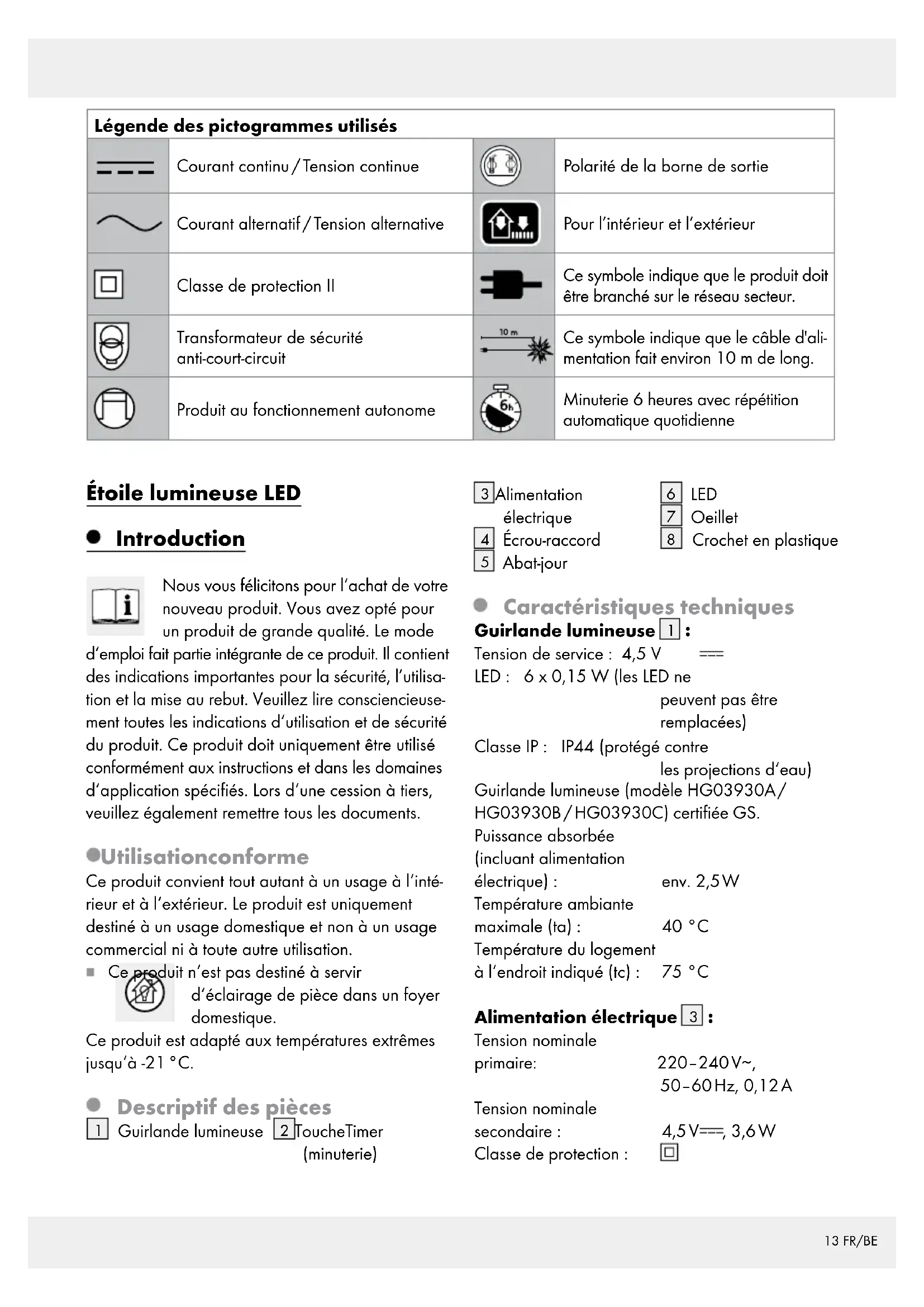 hase. This warranty becomes void if the product has been damaged, or used or maintained improperly. The warranty applies to defects in material or manu- facture. This warranty does not cover product parts subject to normal wear, thus possibly considered consumables (e.g. batteries) or for damage to frag- ile parts, e.g. switches, rechargeable batteries or glass parts. Warranty claim procedure To ensure quick processing of your case, please observe the following instructions: Please have the till receipt and the item number (e.g. IAN 123456_7890) available as proof of purchase. You will find the item number on the rating plate, an engraving on the front page of the instructions for use (bottom left), or as a sticker on the rear or bottom of the product. If functional or other defects occur, please contact the service department listed either by telephone or by e-mail. You can return a defective product to us free of charge to the service address that will be provided to you. Ensure that you enclose the proof of pur- chase (till receipt) and information about what the defect is and when it occurred. Service Service Great Britain Tel.: 08000569216 E-Mail: owim@lidl.co.uk Service Ireland Tel.: 1800 200736 E-Mail: owim@lidl.ie13 FR/BE Légende des pictogrammes utilisés Courant continu / Tension continue Polarité de la borne de sortie Courant alternatif / Tension alternative Pour l’intérieur et l’extérieur Classe de protection II Ce symbole indique que le produit doit être branché sur le réseau secteur. Transformateur de sécurité anti-court-circuit Ce symbole indique que le câble d'ali- mentation fait environ 10 m de long. Produit au fonctionnement autonome Minuterie 6 heures avec répétition automatique quotidienne Étoile lumineuse LED Introduction Nous vous félicitons pour l‘achat de votre nouveau produit. Vous avez opté pour un produit de grande qualité. Le mode d‘emploi fait partie intégrante de ce produit. Il c ontient des indications importantes pour la sécurité, l’utilisa- tion et la mise au rebut. Veuillez lire consciencieuse- ment toutes les indications d‘utilisation et de sécurité du produit. Ce produit doit uniquement être utilisé conformément aux instructions et dans les domaines d‘application spécifiés. Lors d‘une cession à tiers, veuillez également remettre tous les documents. Utilisation conforme Ce produit convient tout autant à un usage à l‘inté- rieur et à l‘extérieur. Le produit est uniquement destiné à un usage domestique et non à un usage commercial ni à toute autre utilisation. Ce produit n‘est pas destiné à servir d‘éclairage de pièce dans un foyer domestique. Ce produit est adapté aux températures extrêmes jusqu‘à -21 °C. Descriptif des pièces