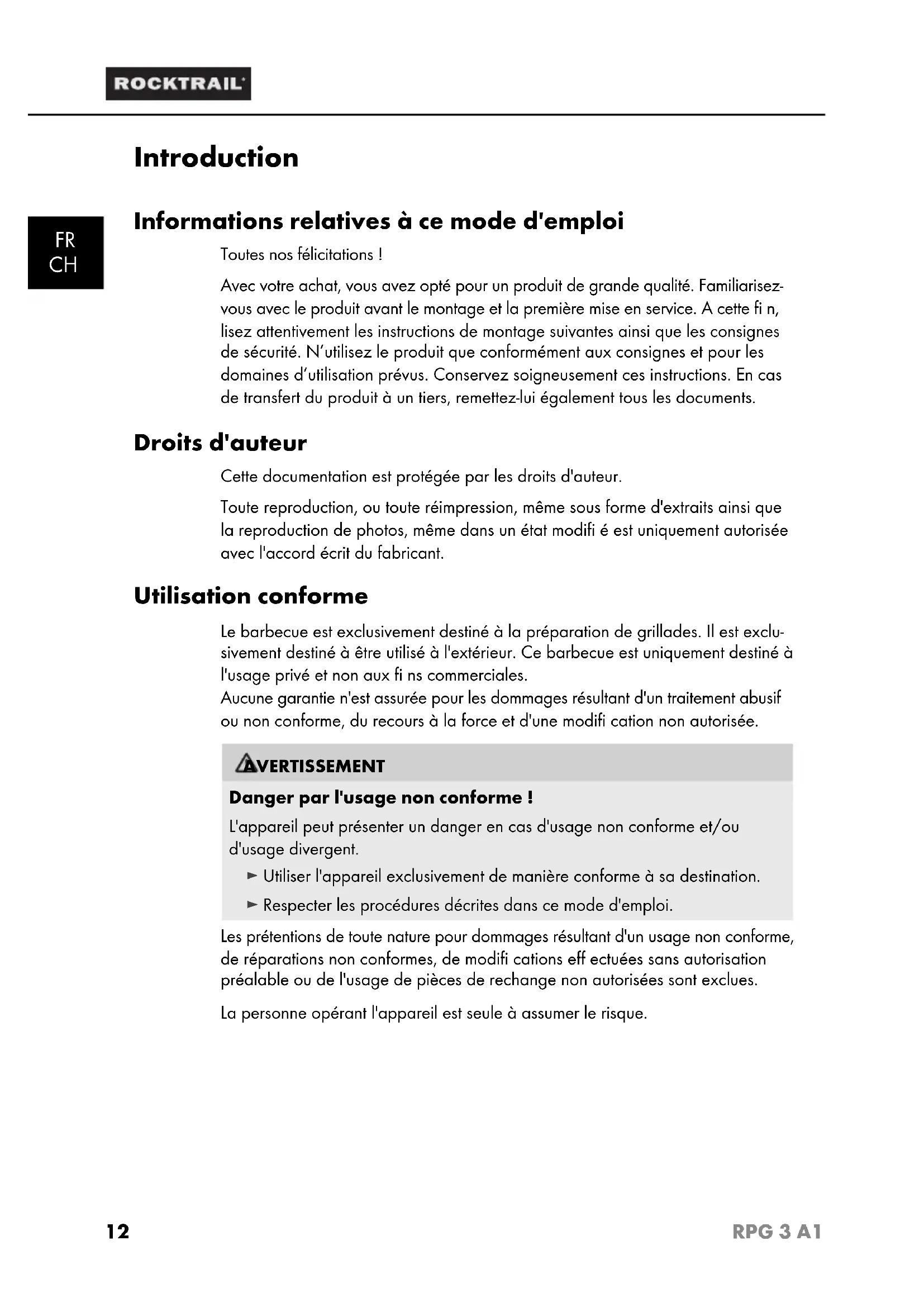 Introduction Informations relatives à ce mode d'emploi Toutes nos félicitations ! Avec votre achat, vous avez opté pour un produit de grande qualité. Familiarisez- vous avec le produit avant le montage et la première mise en service. A cette fi n, lisez attentivement les instructions de montage suivantes ainsi que les consignes de sécurité. N’utilisez le produit que conformément aux consignes et pour les domaines d’utilisation prévus. Conservez soigneusement ces instructions. En cas de transfert du produit à un tiers, remettez-lui également tous les documents. Droits d'auteur Cette documentation est protégée par les droits d'auteur. Toute reproduction, ou toute réimpression, même sous forme d'extraits ainsi que la reproduction de photos, même dans un état modifi é est uniquement autorisée avec l'accord écrit du fabricant. Utilisation conforme Le barbecue est exclusivement destiné à la préparation de grillades. Il est exclu- sivement destiné à être utilisé à l'extérieur. Ce barbecue est uniquement destiné à l'usage privé et non aux fi ns commerciales. Aucune garantie n'est assurée pour les dommages résultant d'un traitement abusif ou non conforme, du recours à la force et d'une modifi cation non autorisée. AVERTISSEMENT Danger par l'usage non conforme ! L'appareil peut présenter un danger en cas d'usage non conforme et/ou d'usage divergent. ► Utiliser l'appareil exclusivement de manière conforme à sa destination. ► Respecter les procédures décrites dans ce mode d'emploi. Les prétentions de toute nature pour dommages résultant d'un usage non conforme, de réparations non conformes, de modifi cations eff ectuées sans autorisation préalable ou de l'usage de pièces de rechange non autorisées sont exclues. La personne opérant l'appareil est seule à assumer le risque. IB_79827_RPG3A1_LB1.indb 12IB_79827_RPG3A1_LB1.indb 12 10.12.12 14:5510.12.12 14:5513 RPG 3 A1