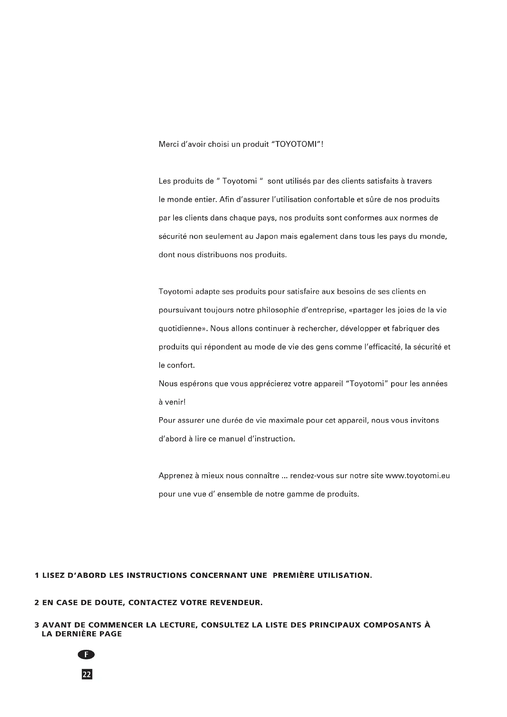 Merci d’avoir choisi un produit “TOYOTOMI”! Les produits de “ Toyotomi “ sont utilisés par des clients satisfaits à travers le monde entier. Afin d’assurer l’utilisation confortable et sûre de nos produits par les clients dans chaque pays, nos produits sont conformes aux normes de sécurité non seulement au Japon mais egalement dans tous les pays du monde, dont nous distribuons nos produits. Toyotomi adapte ses produits pour satisfaire aux besoins de ses clients en poursuivant toujours notre philosophie d’entreprise, «partager les joies de la vie quotidienne». Nous allons continuer à rechercher, développer et fabriquer des produits qui répondent au mode de vie des gens comme l’efficacité, la sécurité et le confort. Nous espérons que vous apprécierez votre appareil “Toyotomi” pour les années à venir! Pour assurer une durée de vie maximale pour cet appareil, nous vous invitons d’abord à lire ce manuel d’instruction. Apprenez à mieux nous connaître ... rendez-vous sur notre site www.toyotomi.eu pour une vue d’ ensemble de notre gamme de produits. 1 Lisez d’abord Les instructions concernant une première utiLisation. 2 en case de doute, contactez votre revendeur. 3 avant de commencer La Lecture, consuLtez La Liste des principaux composants à La dernière page3
