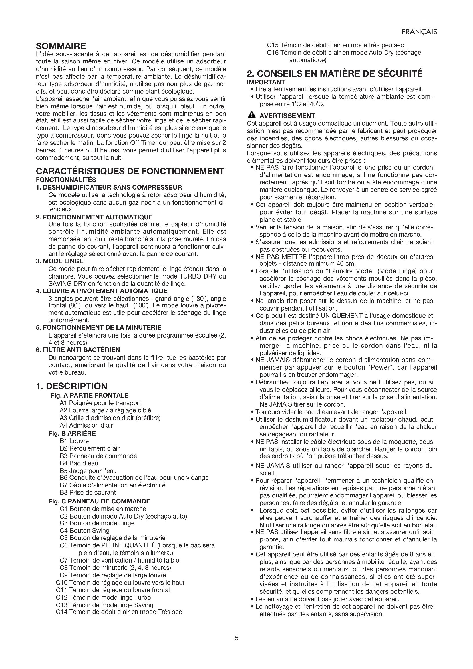 Fig. A PARTIE FRONTALE A1 Poignée pour le transport A2 Louvre large / à réglage ciblé A3 Grille d'admission d'air (préfiltre) A4 Admission d'air Fig. B ARRIÈRE B1 Louvre B2 Refoulement d'air B3 Panneau de commande B4 Bac d'eau B5 Jauge pour l'eau B6 Conduite d'évacuation de l'eau pour une vidange B7 Câble d'alimentation en électricité B8 Prise de courant Fig. C PANNEAU DE COMMANDE C1 Bouton de mise en marche C2 Bouton de mode Auto Dry (séchage auto) C3 Bouton de mode Linge C4 Bouton Swing C5 Bouton de réglage de la minuterie C6 Témoin de PLEINE QUANTITÉ (Lorsque le bac sera plein d'eau, le témoin s'allumera.) C7 Témoin de vérification / humidité faible C8 Témoin de minuterie (2, 4, 8 heures) C9 Témoin de réglage de large louvre C10 Témoin de réglage du louvre vers le haut C11 Témoin de réglage du louvre frontal C12 Témoin de mode linge Turbo C13 Témoin de mode linge Saving C14 Témoin de débit d'air en mode Très sec C15 Témoin de débit d'air en mode très peu sec C16 Témoin de débit d'air en mode Auto Dry (séchage automatique)