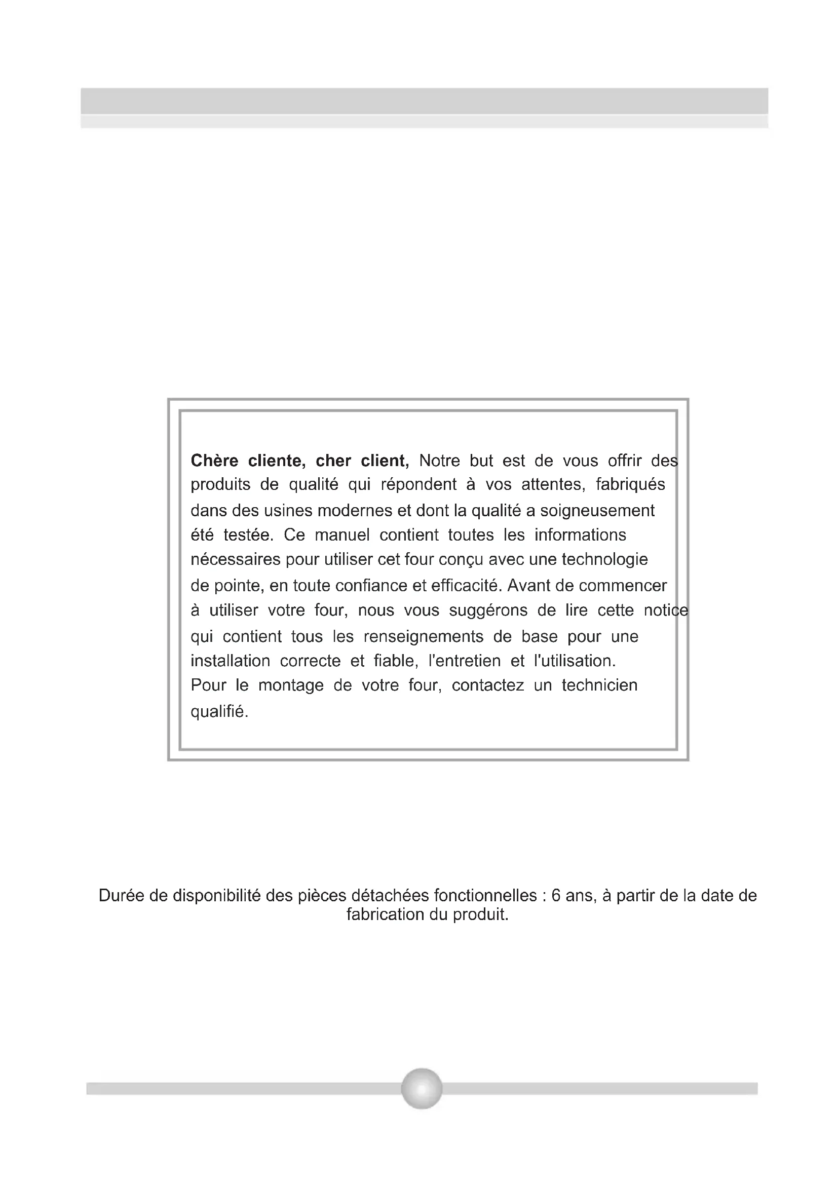 02/2015Chère cliente, cher client, Notre but est de vous offrir des produits de qualité qui répondent à vos attentes, fabriqués dans des usines modernes et dont la qualité a soigneusement été testée. Ce manuel contient toutes les informations nécessaires pour utiliser cet four conçu avec une technologie de pointe, en toute confiance et efficacité. Avant de commencer à utiliser votre four, nous vous suggérons de lire cette notice qui contient tous les renseignements de base pour une installation correcte et fiable, l'entretien et l'utilisation. Pour le montage de votre four, contactez un technicien qualifié. Durée de disponibilité des pièces détachées fonctionnelles : 6 ans, à partir de la date de fabrication du produit.1 Table des matières 1-Présentation et dimensions du four