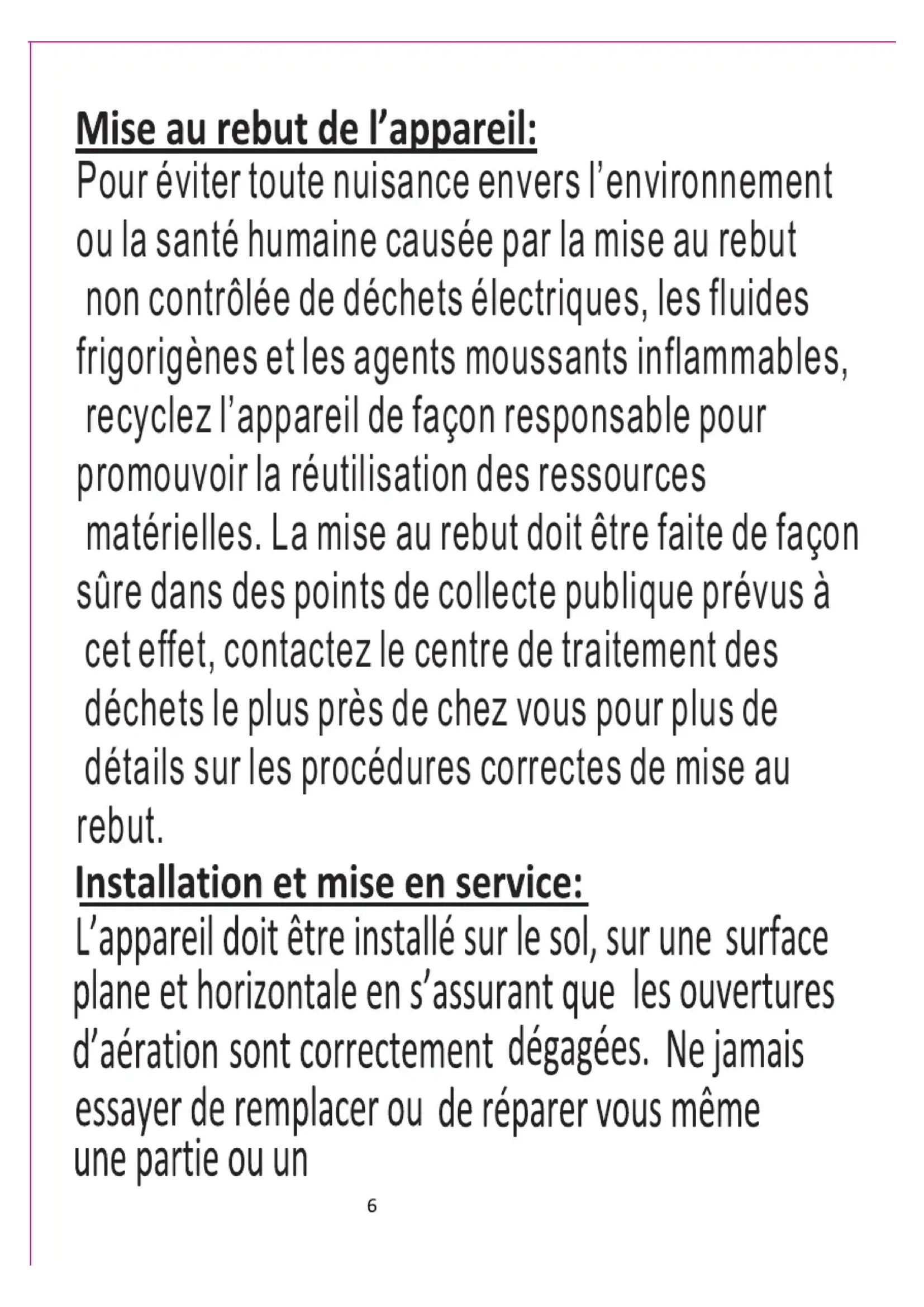Pour éviter toute nuisance envers l’environnement ou la santé humaine causée par la mise au rebut non contrôlée de déchets électriques, les fluides frigorigènes et les agents moussants inflammables, recyclez l’appareil de façon responsable pour promouvoir la réutilisation des ressources matérielles. La mise au rebut doit être faite de façon sûre dans des points de collecte publique prévus à cet effet, contactez le centre de traitement des déchets le plus près de chez vous pour plus de détails sur les procédures correctes de mise au rebut.7