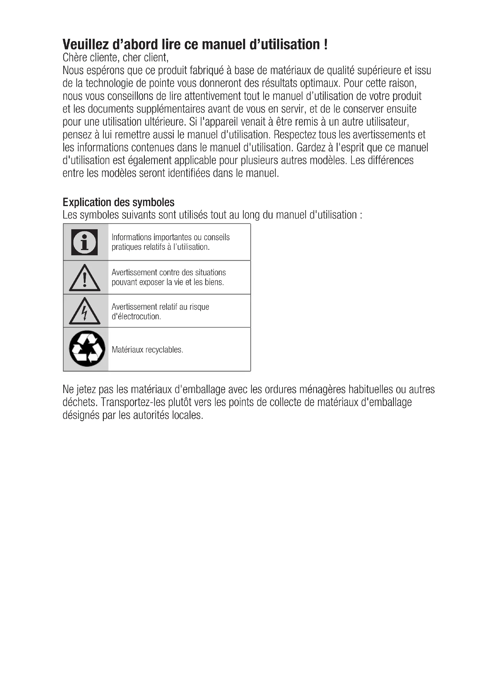 Avertissement relatif au risque d'électrocution. Matériaux recyclables. Ne jetez pas les matériaux d'emballage avec les ordures ménagères habituelles ou autres déchets. Transportez-les plutôt vers les points de collecte de matériaux d'emballage désignés par les autorités locales.3 / FR Lave-linge / Manuel d‘utilisation 1 Consignes générales de sécurité Cette section contient des instructions de sécurité qui permettent d'éviter les blessures et les dégâts matériels. Tous les types de garanties ne sont pas valables si ces instructions ne sont pas respectées.