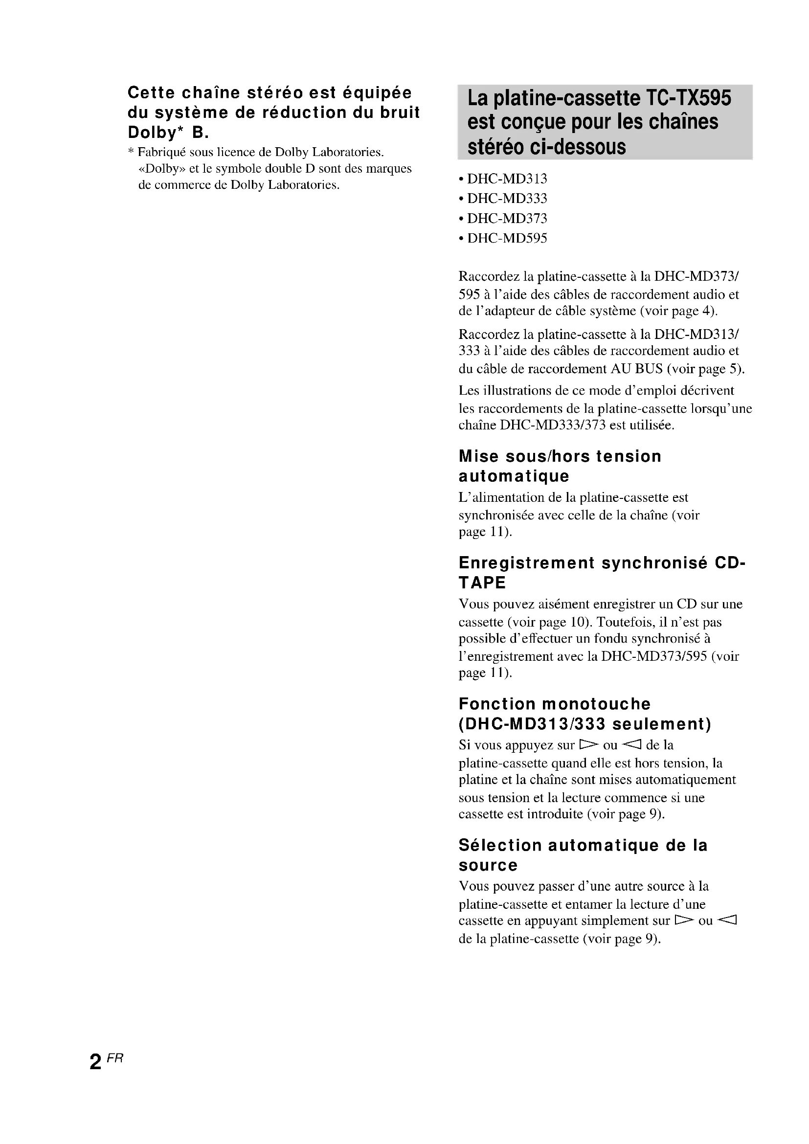- DHC-MD595 Raccordez la platine-cassette à la DHC-MD373/ 595 à l’aide des câbles de raccordement audio et de l’adapteur de câble système (voir page 4). Raccordez la platine-cassette à la DHC-MD313/ 333 à l’aide des câbles de raccordement audio et du câble de raccordement AU BUS (voir page 5). Les illustrations de ce mode d’emploi décrivent les raccordements de la platine-cassette lorsqu’une chaîne DHC-MD333/373 est utilisée. Mise sous/hors tension automatique L’alimentation de la platine-cassette est synchronisée avec celle de la chaîne (voir page 11). Enregistrement synchronisé CD- TAPE Vous pouvez aisément enregistrer un CD sur une cassette (voir page 10). Toutefois, il n’est pas possible d’effectuer un fondu synchronisé à l’enregistrement avec la DHC-MD373/595 (voir page 11). Fonction monotouche (DHC-MD313/333 seulement) Si vous appuyez sur H ou h de la platine-cassette quand elle est hors tension, la platine et la chaîne sont mises automatiquement sous tension et la lecture commence si une cassette est introduite (voir page 9). Sélection automatique de la source Vous pouvez passer d’une autre source à la platine-cassette et entamer la lecture d’une cassette en appuyant simplement sur H ou h de la platine-cassette (voir page 9).3