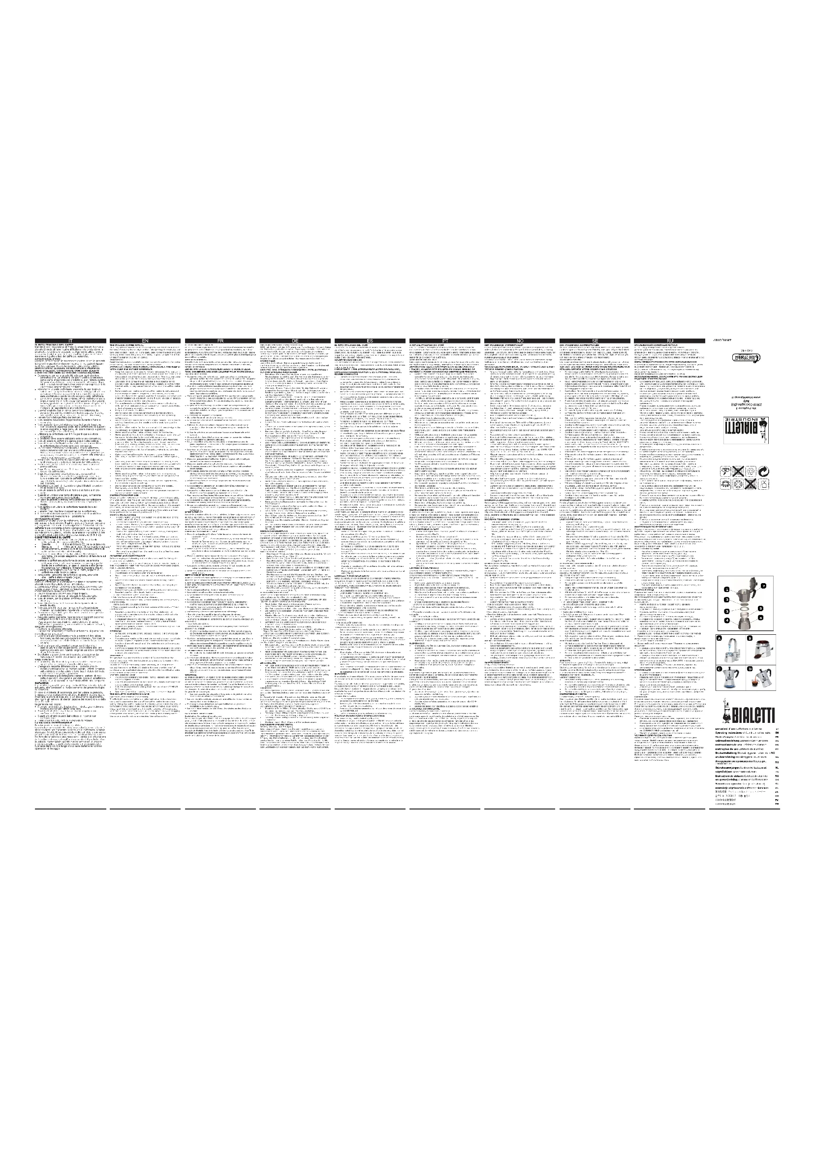 - Les composants remplaçables (fi ltre, entonnoir, joint et manche) sauf en cas de défaut de fabrication. • Les pannes et/ou défauts causés par une utilisation inappropriée ou non conforme aux indications. • Dommages et/ou défauts causés par l’utilisation de pièces de rechange NON COMPATIBLES. • Les dommages causés par des chocs, des chutes ou des dépôts de calcaire.LA SOUPAPE INSPECTABLEExploitation, l’entretien et le nettoyage La soupape inspectable Bialetti est une soupape brevetée qui a été conçue pour garantir l’utilisation en toute sécurité de la cafetière. En effet, le fon-ctionnement des cafetières à eau potable comporte le risque de formation de dépôts de calcaire dans l’orifi ce de la vanne avec le risque d’obstruction et donc de mauvais fonctionnement du produit. Grâce à la soupape inspectable Bialetti, il est très facile d’éviter toute obstruction : il suffi t de procéder aux opérations normales de lavage en actionnant le long de son axe le petit piston qui dépasse de la valve. DAS ITALIENISCHE ESPRESSORITUAL1933 hat Bialetti mit der Erfi ndung der Moka Express Art und Weise der Zubereitung des italienischen Espressos revolutioniert und dabei seiner Kreativität, Kultur und Leidenschaft Ausdruck verliehen. Damals wie heute gibt es die besten Produkte für Ihr Zuhause, wo Sie bei geselligem Zusammensein mit Freunden den einzigartigen Geschmack dieses ursprünglichen Espressos genießen können.WARNUNGENLesen Sie die in dieser Bedienungsanleitung enthaltenen Si-cherheitshinweise sorgfältig, da sie wichtige Angaben zu Sicherheit, Bedienung und Pfl ege des Produkts enthalten. WICHTIG VOR GEBRAUCH SORGFÄLTIG LESEN AUFBEWAH-REN FÜR SPÄTERES NACHLESEN. • Bewahren Sie diese Gebrauchsanleitung zum späteren Nachschlagen sorgfältig auf. Die vorliegende Bedienungsanlei-tung ist Bestandteil des Produkts und muss über die gesamte Lebensdauer des Produkts aufbewahrt werden und verfügbar sein. Die Unterlagen sind allen nachfolgenden Besitzern des Produkts auszuhändigen. • Warnung: Dieses Produkt benötigt für den Betrieb Hitze und erzeugt im Innern einen Überdruck. Ein Nichtbeachten der Bedienungsanleitung kann zu Verbrühungen oder zum Bersten der Espressokanne führen. • Überprüfen Sie vor jedem Gebrauch, ob die Espressokanne unversehrt und vollständig ist, und sich alle Bauteile wie Sicherheitsventil, Trichtereinsatz, Dichtung und Filter in der richtigen Stellung befi nden. Im Zweifelsfall das zuständige den Hersteller oder den Verkäufer der Ware kontaktieren. • Dieses Produkt ist nicht für den Gebrauch durch Personen (einschließlich Kindern) mit eingeschränkten körperlichen, sen-sorischen und geistigen Fähigkeiten oder ohne entsprechende Erfahrung und Anleitung bestimmt. • Das Produkt ist außerhalb der Reichweite von Kindern aufzu-bewahren. • Lassen Sie das Gerät während des Betriebs nicht unbeaufsich-tigt. • Lassen Sie Kindern nicht in die Nähe der Espressokanne, wenn diese in Betrieb ist.