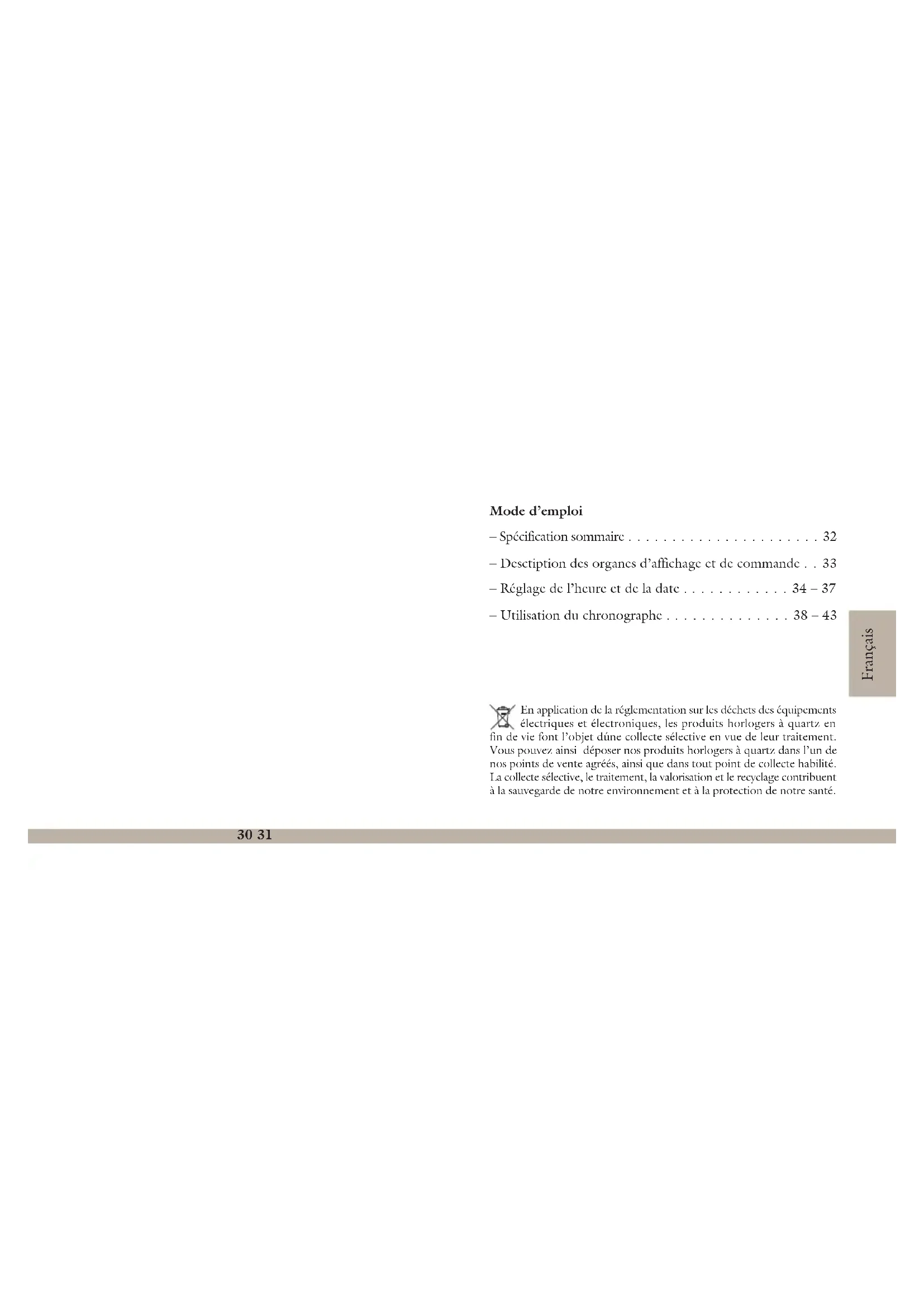 - – 37 – Utilisation du chronographe – 43 En application de la réglementation sur les déchets des équipements électriques et électroniques, les produits horlogers à quartz en fin de vie font l’objet dúne collecte sélective en vue de leur traitement. Vous pouvez ainsi déposer nos produits horlogers à quartz dans l’un de nos points de vente agréés, ainsi que dans tout point de collecte habilité. La collecte sélective, le traitement, la valorisation et le recyclage contribuent à la sauvegarde de notre environnement et à la protection de notre santé. FrançaisFrançais Description des organes d’affichage et de commande Organes d’affichage Organes de commande Poussoir A Couronne Poussoir B Aiguille des minutes Aiguille des heures Compteur des minutes Compteur des heures Compteur des secondes au centre Aiguille des secondes Date p. 38