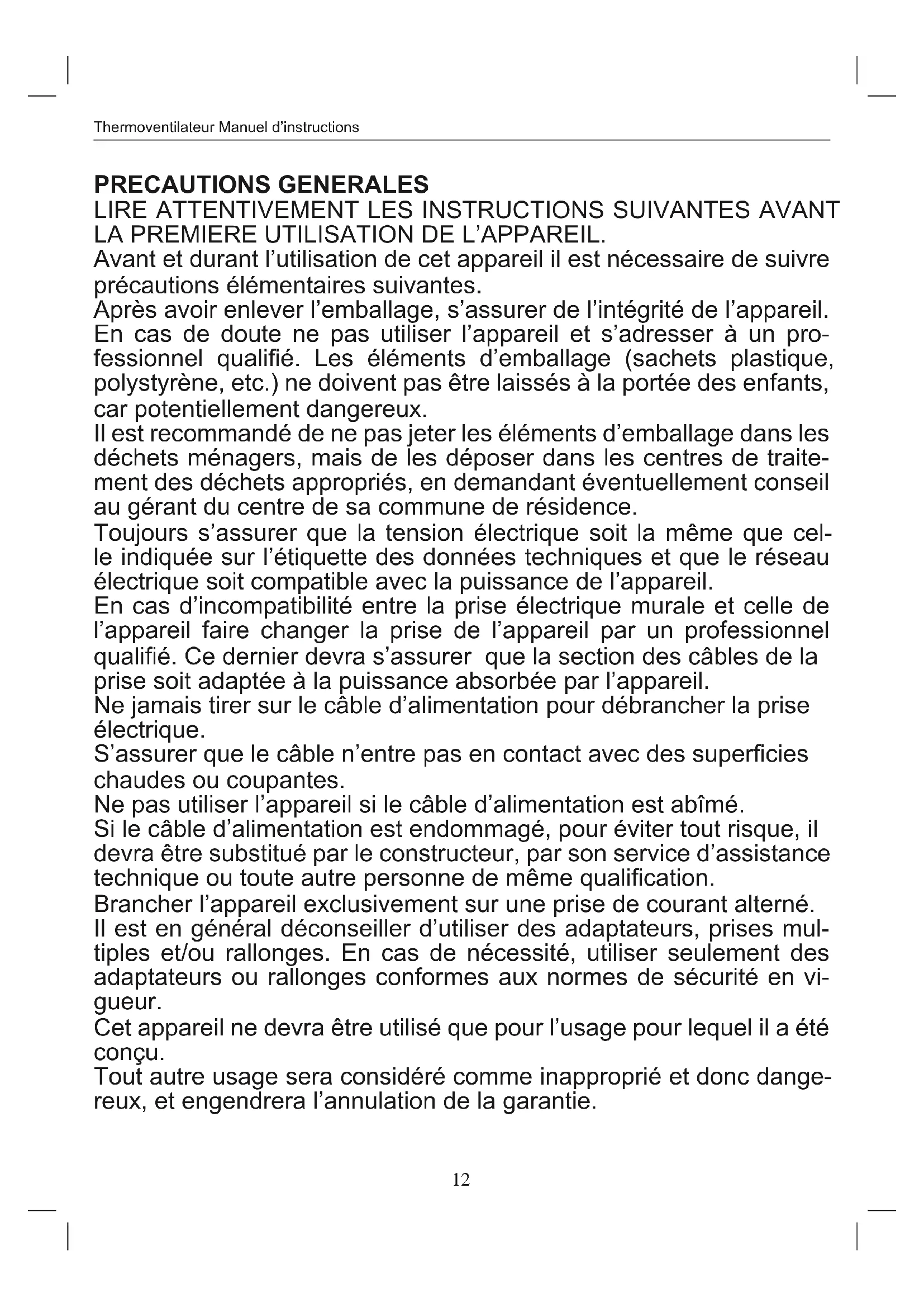Le constructeur ne peut être tenu pour responsable en cas de dom- mages causés par une utilisation incorrecte, inappropriée et dérai- sonnable. Pour éviter tout risque d’échauffement il est recommandé de dérouler entièrement le câble d’alimentation et de débrancher l’appareil de la prise de courant en cas d’inutilisation. Avant d’effectuer toute opération de nettoyage ou entretien, débran- cher l’appareil de la prise de courant électrique. Ne jamais immerger l’appareil dans l’eau ou d’autres liquides. Ne pas toucher l’appareil avec les mains et pieds mouillés ou humi- des. Ne pas utiliser l’appareil si vous êtes pieds nus. Ne pas laisser l’appareil exposé aux agents atmosphériques comme la pluie, le soleil … Ne pas laisser l’appareil près d’une source de chaleur (ex. Radiateur) Ne pas laisser les enfants, les personnes avec des capacités physi- ques, sensorielles ou mentales réduites, ou manquant d’expérience ou de connaissance technique, utiliser cet appareil sans surveillance S’assurer que les enfants ne jouent pas avec cet appareil. DÈS LORS QUE L’APPAREIL DOIT ÊTRE DÉTRUIT, IL EST RECOMMANDÉ DE COUPER LE CÂBLE D’ALI- MENTATION, ET DE RETIRER TOUTES LES PARTIES