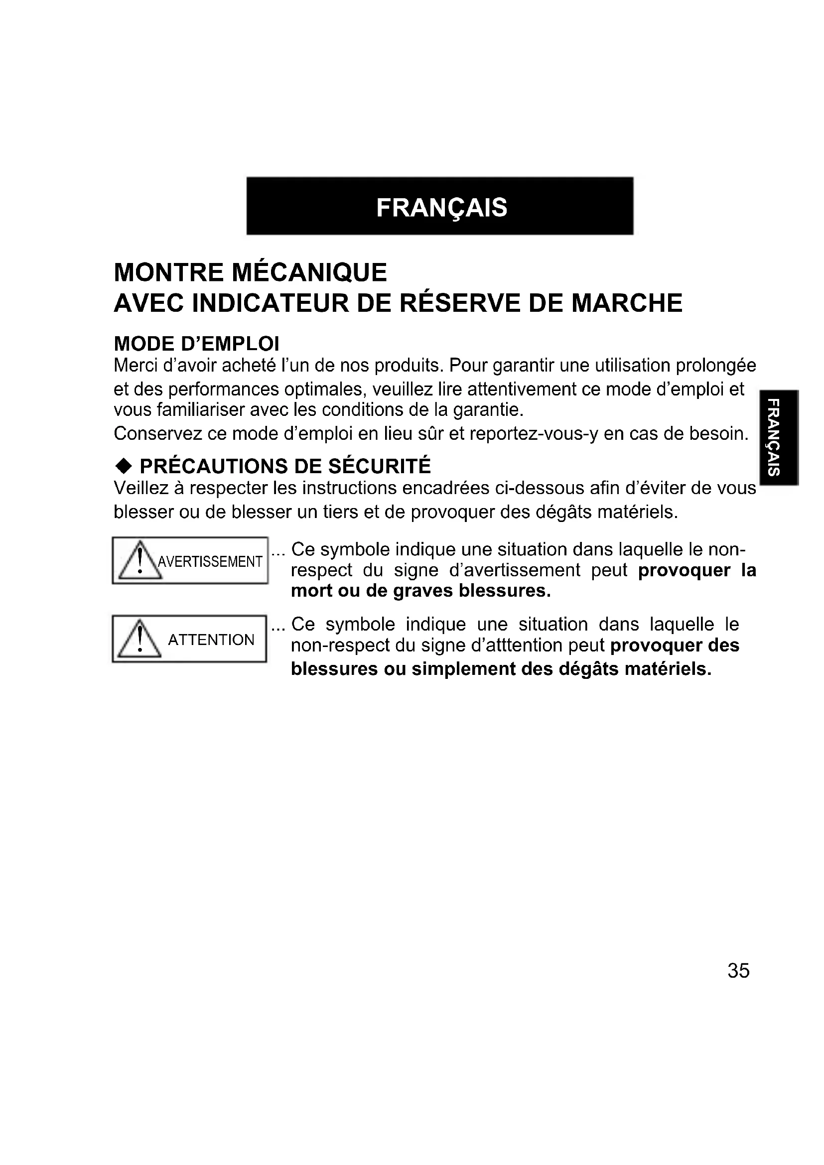 - Il est recommandé d’utiliser la montre de manière appropriée et conformément aux instructions d’utilisation ci-dessus après avoir pris les précautions d’étanchéité indiquées sur le cadran ou à l’arrière.37 FRANÇAIS