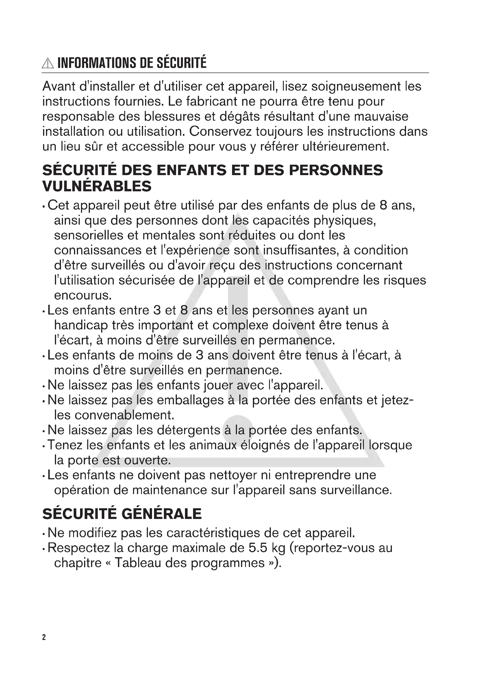 - Respectez la charge maximale de 5.5 kg (reportez-vous au chapitre « Tableau des programmes »). 2• La pression de l'eau en service au niveau du point d'entrée en provenance de l'arrivée d'eau doit être comprise entre 0,5 bar (0,05 MPa) et 8 bar (0,8 MPa).