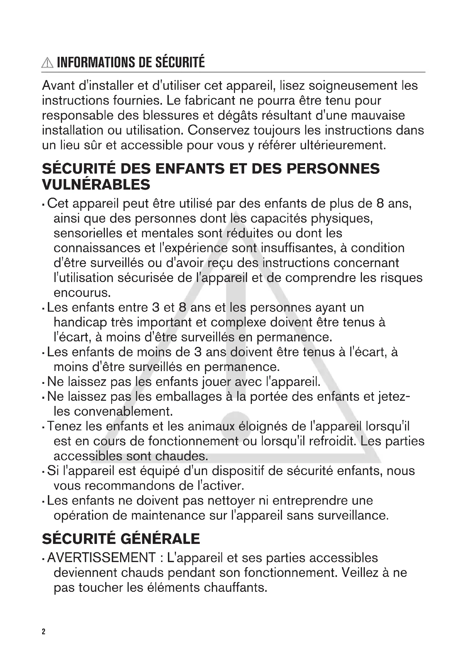 - Si l'appareil est équipé d'un dispositif de sécurité enfants, nous vous recommandons de l'activer.