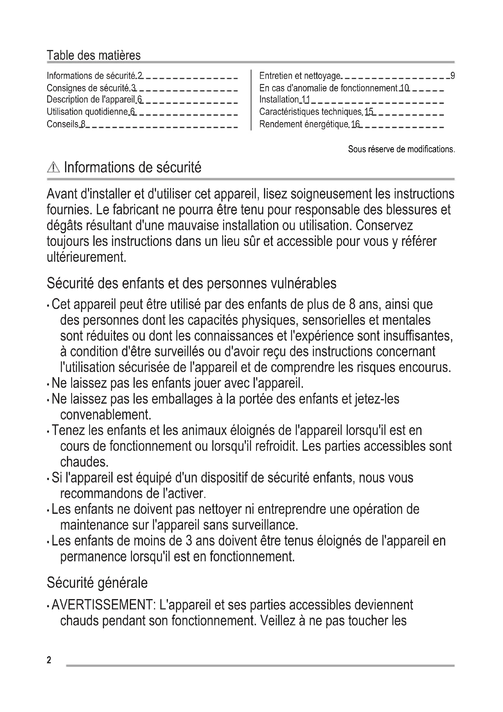 En cas d'anomalie de fonctionnement 10 Installation 11 Caractéristiques techniques 15 Rendement énergétique 16 Sous réserve de modifications. Informations de sécurité Avant d'installer et d'utiliser cet appareil, lisez soigneusement les instructions fournies. Le fabricant ne pourra être tenu pour responsable des blessures et dégâts résultant d'une mauvaise installation ou utilisation. Conservez toujours les instructions dans un lieu sûr et accessible pour vous y référer ultérieurement. Sécurité des enfants et des personnes vulnérables