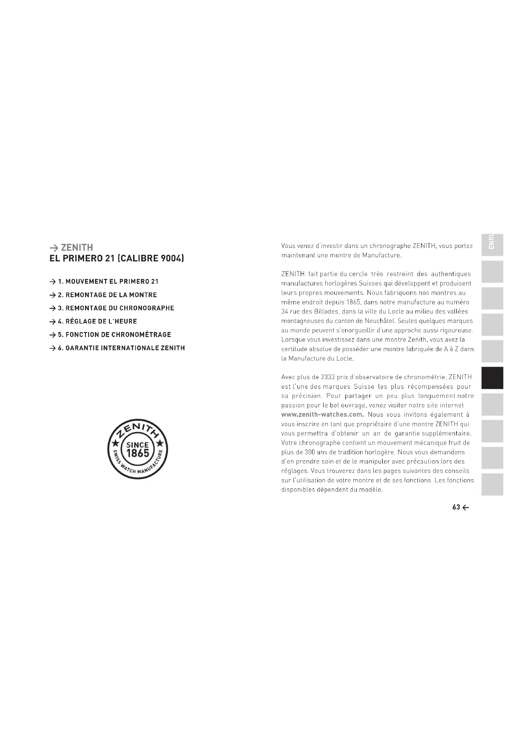 > ZENITH EL PRIMERO 21 (CALIBRE 9004) Vous venez d’investir dans un chronographe ZENITH, vous portez maintenant une montre de Manufacture. ZENITH fait partie du cercle très restreint des authentiques manufactures horlogères Suisses qui développent et produisent leurs propres mouvements. Nous fabriquons nos montres au même endroit depuis 1865, dans notre manufacture au numéro 34 rue des Billodes, dans la ville du Locle au milieu des vallées montagneuses du canton de Neuchâtel. Seules quelques marques au monde peuvent s’enorgueillir d’une approche aussi rigoureuse. Lorsque vous investissez dans une montre Zenith, vous avez la certitude absolue de posséder une montre fabriquée de A à Z dans la Manufacture du Locle. Avec plus de 2333 prix d’observatoire de chronométrie, ZENITH est l’une des marques Suisse les plus récompensées pour sa précision. Pour partager un peu plus longuement notre passion pour le bel ouvrage, venez visiter notre site internet www.zenith-watches.com. Nous vous invitons également à vous inscrire en tant que propriétaire d’une montre ZENITH qui vous permettra d’obtenir un an de garantie supplémentaire. Votre chronographe contient un mouvement mécanique fruit de plus de 300 ans de tradition horlogère. Nous vous demandons d’en prendre soin et de le manipuler avec précaution lors des réglages. Vous trouverez dans les pages suivantes des conseils sur l’utilisation de votre montre et de ses fonctions. Les fonctions disponibles dépendent du modèle.65 <