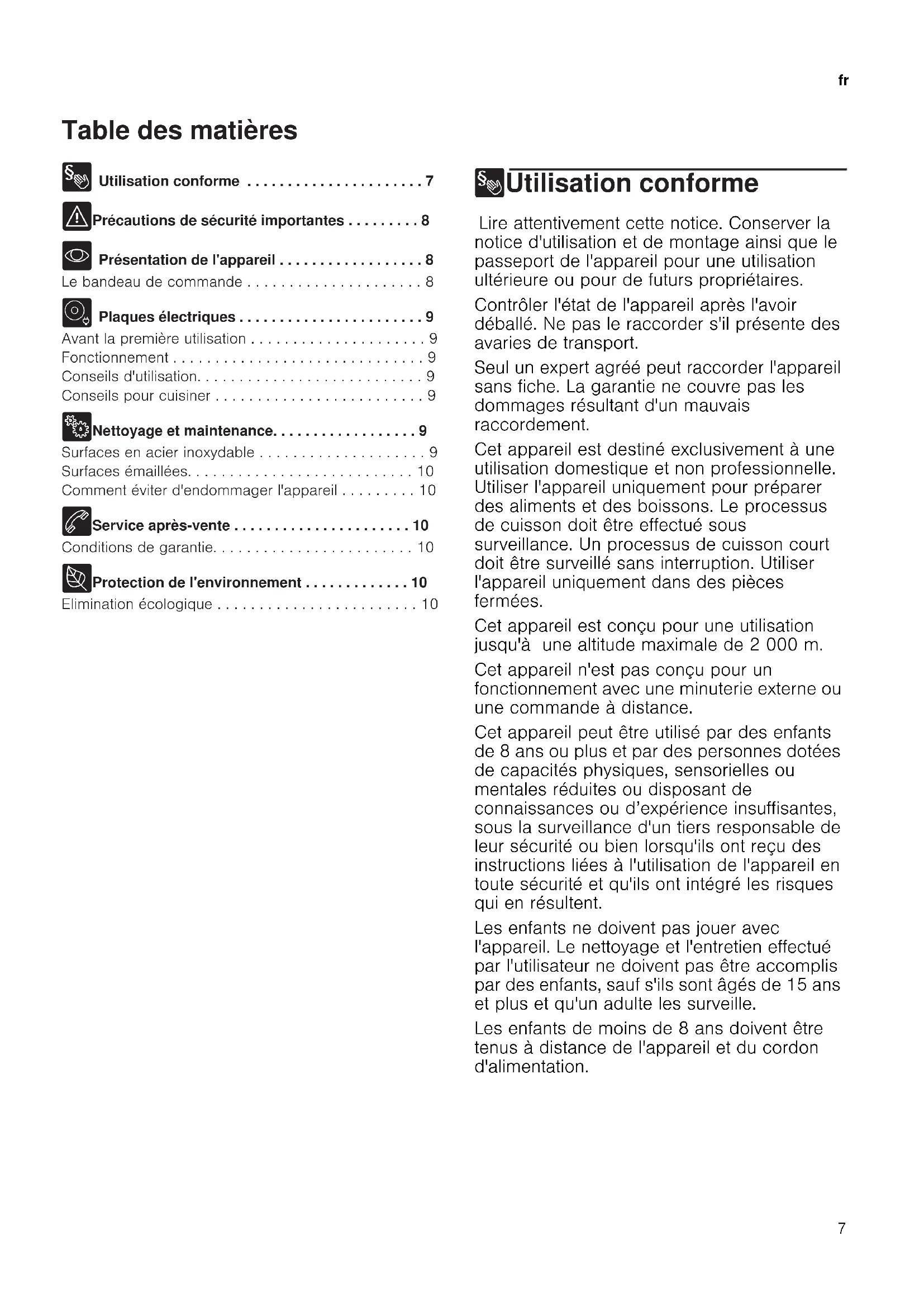 - Présentation de l'appareil . . . . . . . . . . . . . . . . . . 8 Le bandeau de commande . . . . . . . . . . . . . . . . . . . . . 8 ~ Plaques électriques . . . . . . . . . . . . . . . . . . . . . . . 9 Avant la première utilisation . . . . . . . . . . . . . . . . . . . . . 9 Fonctionnement . . . . . . . . . . . . . . . . . . . . . . . . . . . . . . 9 Conseils d'utilisation. . . . . . . . . . . . . . . . . . . . . . . . . . . 9 Conseils pour cuisiner . . . . . . . . . . . . . . . . . . . . . . . . . 9 2 Nettoyage et maintenance. . . . . . . . . . . . . . . . . . 9 Surfaces en acier inoxydable . . . . . . . . . . . . . . . . . . . . 9 Surfaces émaillées. . . . . . . . . . . . . . . . . . . . . . . . . . . 10 Comment éviter d'endommager l'appareil . . . . . . . . . 10 4 Service après-vente . . . . . . . . . . . . . . . . . . . . . . 10 Conditions de garantie. . . . . . . . . . . . . . . . . . . . . . . . 10 7 Protection de l'environnement . . . . . . . . . . . . . 10 Elimination écologique . . . . . . . . . . . . . . . . . . . . . . . . 10 8Utilisation conforme Ut i l i s a t i o n conf or me Lire attentivement cette notice. Conserver la notice d'utilisation et de montage ainsi que le passeport de l'appareil pour une utilisation ultérieure ou pour de futurs propriétaires. Contrôler l'état de l'appareil après l'avoir déballé. Ne pas le raccorder s'il présente des avaries de transport. Seul un expert agréé peut raccorder l'appareil sans fiche. La garantie ne couvre pas les dommages résultant d'un mauvais raccordement. Cet appareil est destiné exclusivement à une utilisation domestique et non professionnelle. Utiliser l'appareil uniquement pour préparer des aliments et des boissons. Le processus de cuisson doit être effectué sous surveillance. Un processus de cuisson court doit être surveillé sans interruption. Utiliser l'appareil uniquement dans des pièces fermées. Cet appareil est conçu pour une utilisation jusqu'à une altitude maximale de 2 000 m. Cet appareil n'est pas conçu pour un fonctionnement avec une minuterie externe ou une commande à distance. Cet appareil peut être utilisé par des enfants de 8 ans ou plus et par des personnes dotées de capacités physiques, sensorielles ou mentales réduites ou disposant de connaissances ou d’expérience insuffisantes, sous la surveillance d'un tiers responsable de leur sécurité ou bien lorsqu'ils ont reçu des instructions liées à l'utilisation de l'appareil en toute sécurité et qu'ils ont intégré les risques qui en résultent. Les enfants ne doivent pas jouer avec l'appareil. Le nettoyage et l'entretien effectué par l'utilisateur ne doivent pas être accomplis par des enfants, sauf s'ils sont âgés de 15 ans et plus et qu'un adulte les surveille. Les enfants de moins de 8 ans doivent être tenus à distance de l'appareil et du cordon d'alimentation.fr Précautions de sécurité importantes