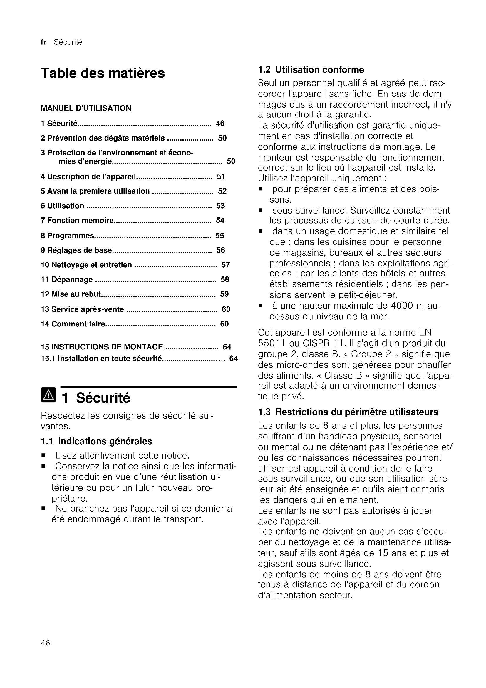 1 Sécurité Respectez les consignes de sécurité sui- vantes. 1.1 Indications générales ¡ Lisez attentivement cette notice. ¡ Conservez la notice ainsi que les informati- ons produit en vue d’une réutilisation ul- térieure ou pour un futur nouveau pro- priétaire. ¡ Ne branchez pas l’appareil si ce dernier a été endommagé durant le transport. 1.2 Utilisation conforme Seul un personnel qualifié et agréé peut rac- corder l'appareil sans fiche. En cas de dom- mages dus à un raccordement incorrect, il n'y a aucun droit à la garantie. La sécurité d'utilisation est garantie unique- ment en cas d'installation correcte et conforme aux instructions de montage. Le monteur est responsable du fonctionnement correct sur le lieu où l'appareil est installé. Utilisez l‘appareil uniquement: ¡ pour préparer des aliments et des bois- sons. ¡ sous surveillance. Surveillez constamment les processus de cuisson de courte durée. ¡ dans un usage domestique et similaire tel que: dans les cuisines pour le personnel de magasins, bureaux et autres secteurs professionnels; dans les exploitations agri- coles; par les clients des hôtels et autres établissements résidentiels; dans les pen- sions servent le petit-déjeuner. ¡ à une hauteur maximale de 4000m au- dessus du niveau de la mer. Cet appareil est conforme à la norme EN 55011 ou CISPR 11. Il s'agit d'un produit du groupe 2, classe B. «Groupe 2» signifie que des micro-ondes sont générées pour chauffer des aliments. «Classe B» signifie que l'appa- reil est adapté à un environnement domes- tique privé. 1.3 Restrictions du périmètre utilisateurs Les enfants de 8 ans et plus, les personnes souffrant d’un handicap physique, sensoriel ou mental ou ne détenant pas l’expérience et/ ou les connaissances nécessaires pourront utiliser cet appareil à condition de le faire sous surveillance, ou que son utilisation sûre leur ait été enseignée et qu’ils aient compris les dangers qui en émanent. Les enfants ne sont pas autorisés à jouer avec l'appareil. Les enfants ne doivent en aucun cas s’occu- per du nettoyage et de la maintenance utilisa- teur, sauf s’ils sont âgés de 15ans et plus et agissent sous surveillance. Les enfants de moins de 8ans doivent être tenus à distance de l’appareil et du cordon d’alimentation secteur.Sécurité fr