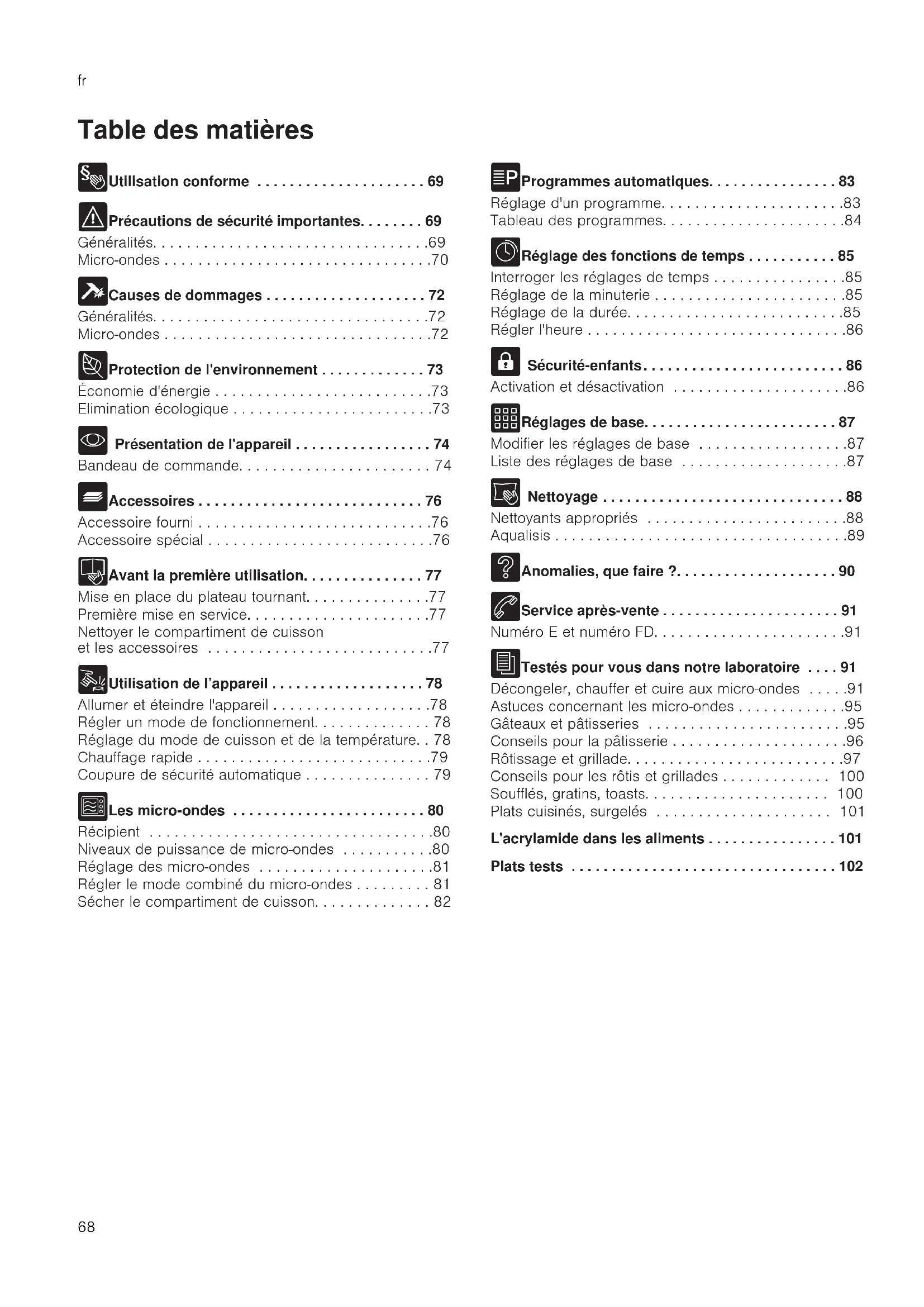 - Présentation de l'appareil . . . . . . . . . . . . . . . . . 74 Bandeau de commande. . . . . . . . . . . . . . . . . . . . . . . 74 _ Accessoires . . . . . . . . . . . . . . . . . . . . . . . . . . . . 76 Accessoire fourni . . . . . . . . . . . . . . . . . . . . . . . . . . . .76 Accessoire spécial . . . . . . . . . . . . . . . . . . . . . . . . . . .76 K Avant la première utilisation. . . . . . . . . . . . . . . 77 Mise en place du plateau tournant. . . . . . . . . . . . . . .77 Première mise en service. . . . . . . . . . . . . . . . . . . . . .77 Nettoyer le compartiment de cuisson et les accessoires . . . . . . . . . . . . . . . . . . . . . . . . . . .77 1 Utilisation de l’appareil . . . . . . . . . . . . . . . . . . . 78 Allumer et éteindre l'appareil . . . . . . . . . . . . . . . . . . .78 Régler un mode de fonctionnement. . . . . . . . . . . . . . 78 Réglage du mode de cuisson et de la température. . 78 Chauffage rapide . . . . . . . . . . . . . . . . . . . . . . . . . . . .79 Coupure de sécurité automatique . . . . . . . . . . . . . . . 79 ^ Les micro-ondes . . . . . . . . . . . . . . . . . . . . . . . . 80 Récipient . . . . . . . . . . . . . . . . . . . . . . . . . . . . . . . . . .80 Niveaux de puissance de micro-ondes . . . . . . . . . . .80 Réglage des micro-ondes . . . . . . . . . . . . . . . . . . . . .81 Régler le mode combiné du micro-ondes . . . . . . . . . 81 Sécher le compartiment de cuisson. . . . . . . . . . . . . . 82 P Programmes automatiques. . . . . . . . . . . . . . . . 83 Réglage d'un programme. . . . . . . . . . . . . . . . . . . . . .83 Tableau des programmes. . . . . . . . . . . . . . . . . . . . . .84 O Réglage des fonctions de temps . . . . . . . . . . . 85 Interroger les réglages de temps . . . . . . . . . . . . . . . .85 Réglage de la minuterie . . . . . . . . . . . . . . . . . . . . . . .85 Réglage de la durée. . . . . . . . . . . . . . . . . . . . . . . . . .85 Régler l'heure . . . . . . . . . . . . . . . . . . . . . . . . . . . . . . .86 A Sécurité-enfants. . . . . . . . . . . . . . . . . . . . . . . . . 86 Activation et désactivation . . . . . . . . . . . . . . . . . . . . .86 Q Réglages de base. . . . . . . . . . . . . . . . . . . . . . . . 87 Modifier les réglages de base . . . . . . . . . . . . . . . . . .87 Liste des réglages de base . . . . . . . . . . . . . . . . . . . .87 D Nettoyage . . . . . . . . . . . . . . . . . . . . . . . . . . . . . . 88 Nettoyants appropriés . . . . . . . . . . . . . . . . . . . . . . . .88 Aqualisis . . . . . . . . . . . . . . . . . . . . . . . . . . . . . . . . . . .89 3 Anomalies, que faire ?. . . . . . . . . . . . . . . . . . . . 90 4 Service après-vente . . . . . . . . . . . . . . . . . . . . . . 91 Numéro E et numéro FD. . . . . . . . . . . . . . . . . . . . . . .91 J Testés pour vous dans notre laboratoire . . . . 91 Décongeler, chauffer et cuire aux micro-ondes . . . . .91 Astuces concernant les microondes . . . . . . . . . . . . .95 Gâteaux et pâtisseries . . . . . . . . . . . . . . . . . . . . . . . .95 Conseils pour la pâtisserie . . . . . . . . . . . . . . . . . . . . .96 Rôtissage et grillade. . . . . . . . . . . . . . . . . . . . . . . . . .97 Conseils pour les rôtis et grillades . . . . . . . . . . . . . 100 Soufflés, gratins, toasts. . . . . . . . . . . . . . . . . . . . . . 100 Plats cuisinés, surgelés . . . . . . . . . . . . . . . . . . . . . 101 L'acrylamide dans les aliments . . . . . . . . . . . . . . . . 101 Plats tests . . . . . . . . . . . . . . . . . . . . . . . . . . . . . . . . . 102Utilisation conforme fr
