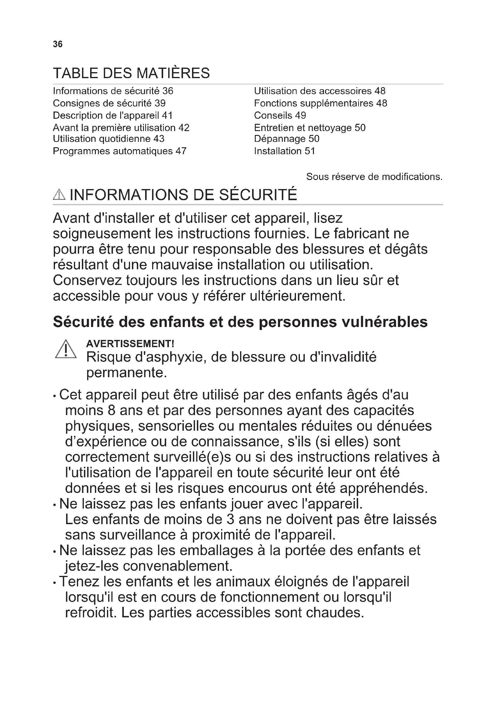 Informations de sécurité 36 Consignes de sécurité 39 Description de l'appareil 41 Avant la première utilisation 42 Utilisation quotidienne 43 Programmes automatiques 47 Utilisation des accessoires 48 Fonctions supplémentaires 48 Conseils 49 Entretien et nettoyage 50 Dépannage 50 Installation 51 Sous réserve de modifications.