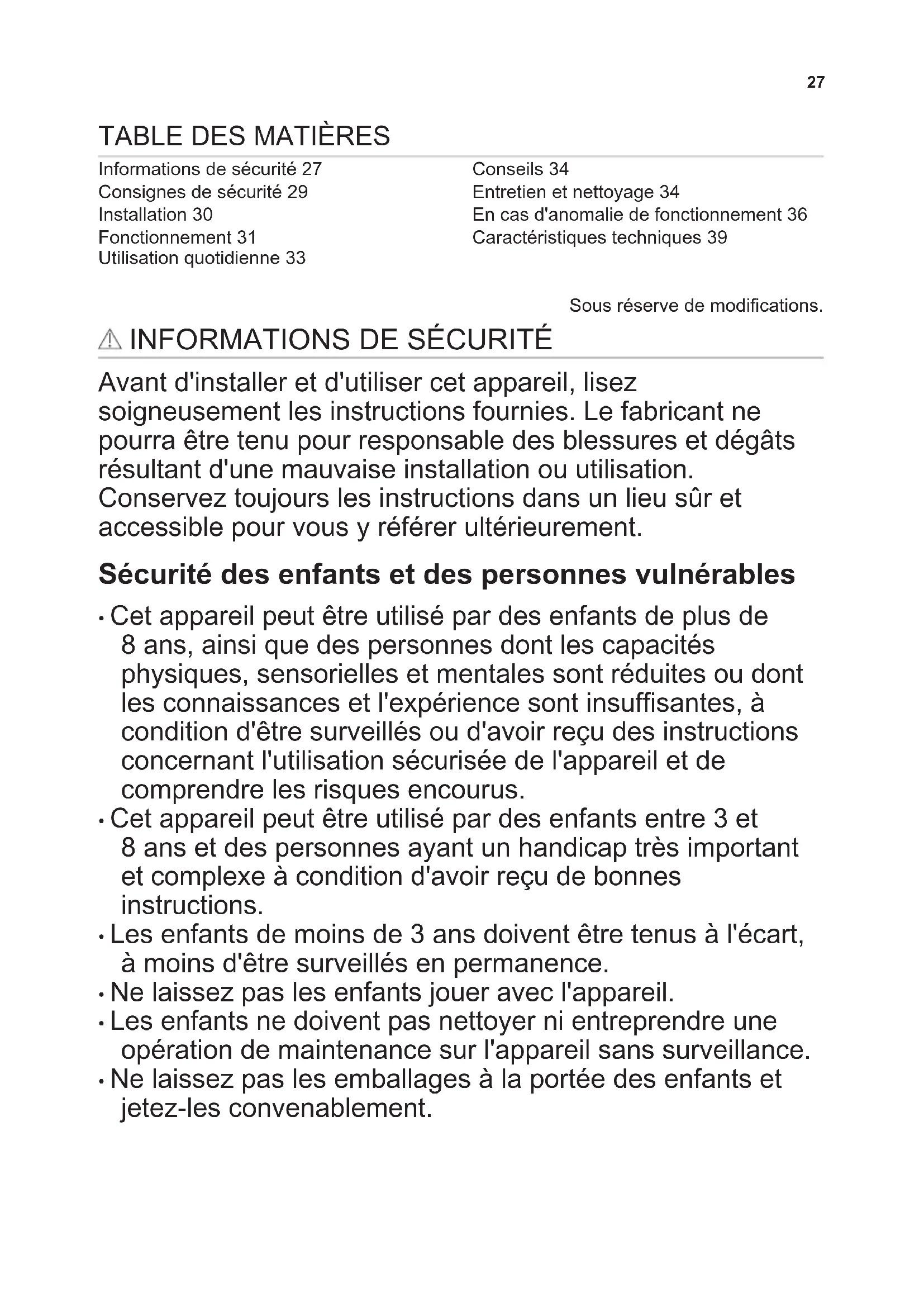 Informations de sécurité 27 Consignes de sécurité 29 Installation 30 Fonctionnement 31 Utilisation quotidienne 33 Conseils 34 Entretien et nettoyage 34 En cas d'anomalie de fonctionnement 36 Caractéristiques techniques 39 Sous réserve de modifications.