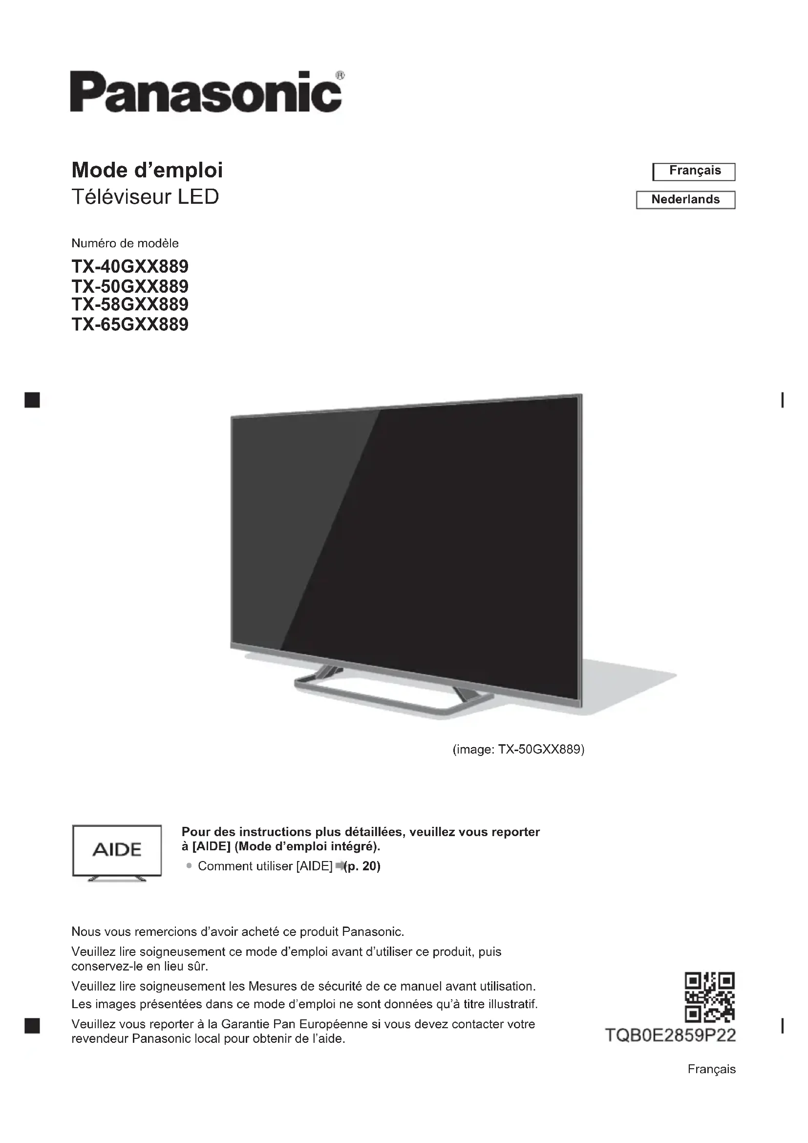 Nous vous remercions d’avoir acheté ce produit Panasonic. Veuillez lire soigneusement ce mode d’emploi avant d’utiliser ce produit, puis conservez-le en lieu sûr. Veuillez lire soigneusement les Mesures de sécurité de ce manuel avant utilisation. Les images présentées dans ce mode d’emploi ne sont données qu’à titre illustratif. Veuillez vous reporter à la Garantie Pan Européenne si vous devez contacter votre revendeur Panasonic local pour obtenir de l’aide. Français Numéro de modèle TX-40GXX889 TX-50GXX889 TX-58GXX889 TX-65GXX889 Mode d’emploi Téléviseur LED Pour des instructions plus détaillées, veuillez vous reporter à [AIDE] (Mode d’emploi intégré).