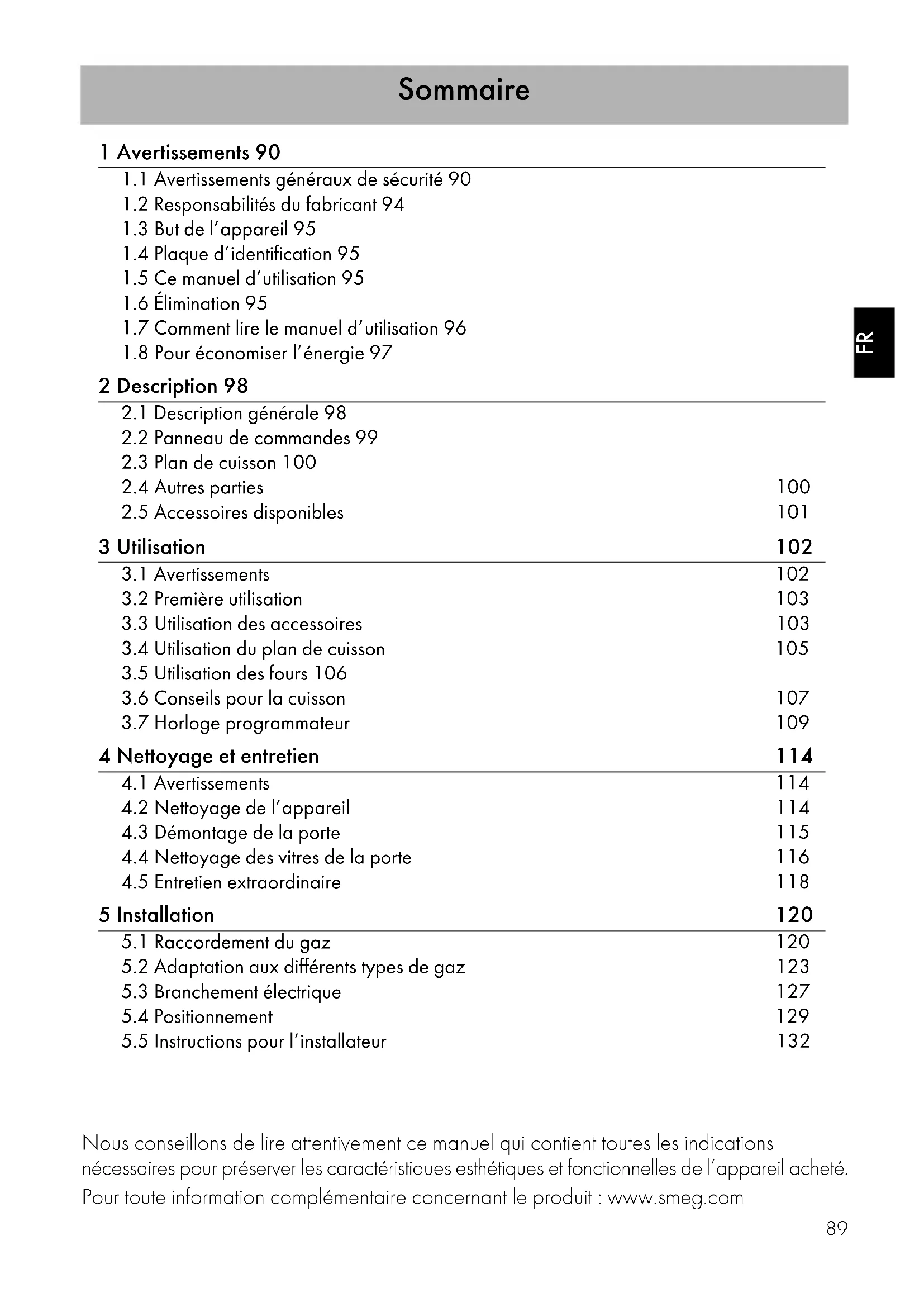 Nous conseillons de lire attentivement ce manuel qui contient toutes les indications nécessaires pour préserver les caractéristiques esthétiques et fonctionnelles de l’appareil acheté. Pour toute information complémentaire concernant le produit : www.smeg.comAvertissements