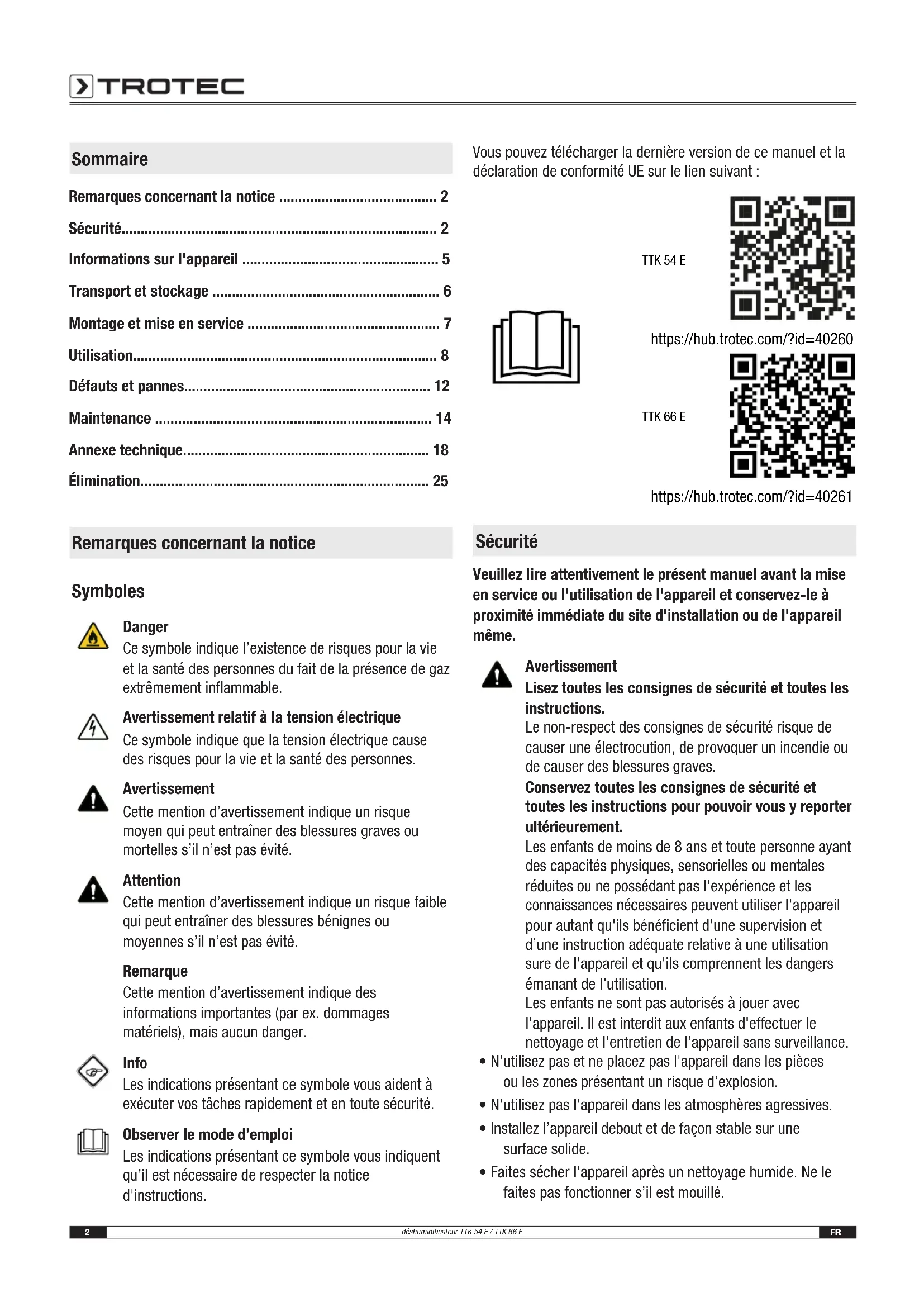 - Élimination Remarques concernant la notice Symboles Danger Ce symbole indique l’existence de risques pour la vie et la santé des personnes du fait de la présence de gaz extrêmement inflammable. Avertissement relatif à la tension électrique Ce symbole indique que la tension électrique cause des risques pour la vie et la santé des personnes. Avertissement Cette mention d’avertissement indique un risque moyen qui peut entraîner des blessures graves ou mortelles s’il n’est pas évité. Attention Cette mention d’avertissement indique un risque faible qui peut entraîner des blessures bénignes ou moyennes s’il n’est pas évité. Remarque Cette mention d’avertissement indique des informations importantes (par ex. dommages matériels), mais aucun danger. Info Les indications présentant ce symbole vous aident à exécuter vos tâches rapidement et en toute sécurité. Observer le mode d’emploi Les indications présentant ce symbole vous indiquent qu’il est nécessaire de respecter la notice d'instructions. Vous pouvez télécharger la dernière version de ce manuel et la déclaration de conformitéUE sur le lien suivant: TTK 54 E https://hub.trotec.com/?id=40260 TTK 66 E https://hub.trotec.com/?id=40261 Sécurité Veuillez lire attentivement le présent manuel avant la mise en service ou l'utilisation de l'appareil et conservez-le à proximité immédiate du site d'installation ou de l'appareil même. Avertissement Lisez toutes les consignes de sécurité et toutes les instructions. Le non-respect des consignes de sécurité risque de causer une électrocution, de provoquer un incendie ou de causer des blessures graves. Conservez toutes les consignes de sécurité et toutes les instructions pour pouvoir vous y reporter ultérieurement. Les enfants de moins de 8 ans et toute personne ayant des capacités physiques, sensorielles ou mentales réduites ou ne possédant pas l'expérience et les connaissances nécessaires peuvent utiliser l'appareil pour autant qu'ils bénéficient d'une supervision et d’une instruction adéquate relative à une utilisation sure de l'appareil et qu'ils comprennent les dangers émanant de l’utilisation. Les enfants ne sont pas autorisés à jouer avec l'appareil. Il est interdit aux enfants d'effectuer le nettoyage et l'entretien de l’appareil sans surveillance. p. 25