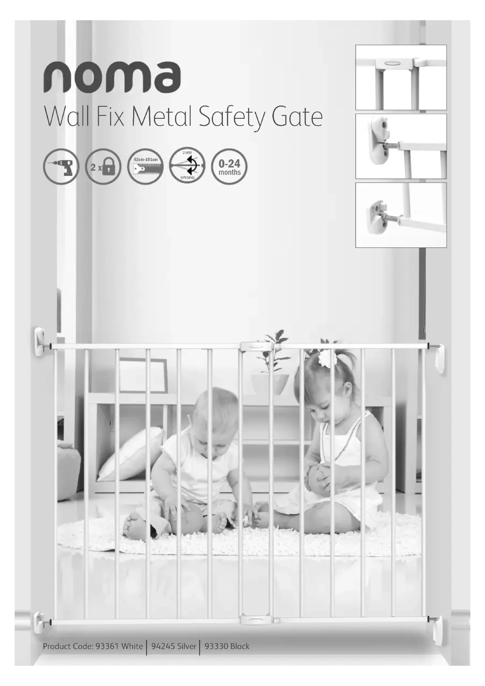 Double système de verrouillage et d’ouverture manuel NOTE: Nous vous demandons de bien vouloir vous inscrire avant l’installation votre barrière de sécurité, de sorte que la garantie est en vigueur. Envoyez-nous un email avec votre preuve d’achat, le nom et l’adresse a service@nomahomesafety.com NOTE: Nous vous demandons de bien vouloir vous inscrire avant l’installation votre barrière de sécurité, de sorte que la garantie est en vigueur. Envoyez-nous un email avec votre preuve d’achat, le nom et l’adresse a service@nomahomesafety.com Veuillez lire, suivre et conserver ce mode d’emploi avec précaution afin d’assurer une installation correcte et pour pouvoir vous y référer ultérieurement. Veuillez inspecter votre barrière de sécurité lors de la réception et reportez-vous à la section « Contenus » présente sur la première page au dos des illustrations. Veuillez vérifier que toutes les pièces sont présentes, correctes et en bon état de marche. Si vous constatez des dommages ou toute pièce manquante, ne pas assembler.Nous vous recommandons d’effectuer l’installation hors de portée des jeunes enfants car certaines petites pièces peuventprésenter un risque d’étouffement.Informations importantes Veuillez vérifier la barrière régulièrement afin de vous assurer que la barrière et toutes les pièces sont en bon état de marche. Si la barrière est utilisée en haut d’escaliers, elle doit être placée sur la surface au-dessus de la première marche et s’ouvrir dans le sens contraire aux escaliers. Si la barrière est utilisée en bas d’escaliers, veuillez la placer vers l’avant de la dernière marche. La barrière de sécurité ne doit pas être placée devant des fenêtres. Assurez-vous que la porte est installée entre deux surfaces propres et ayant une structure solide. Assurez-vous que des fixations appropriées sont utilisées pour le plâtre, le bois, les briques, etc. Des chevilles sont fournies. Si vous ne parvenez pas à fixer au mur de manière satisfaisante, consultez une quincaillerie pour obtenir des fixations adéquates.