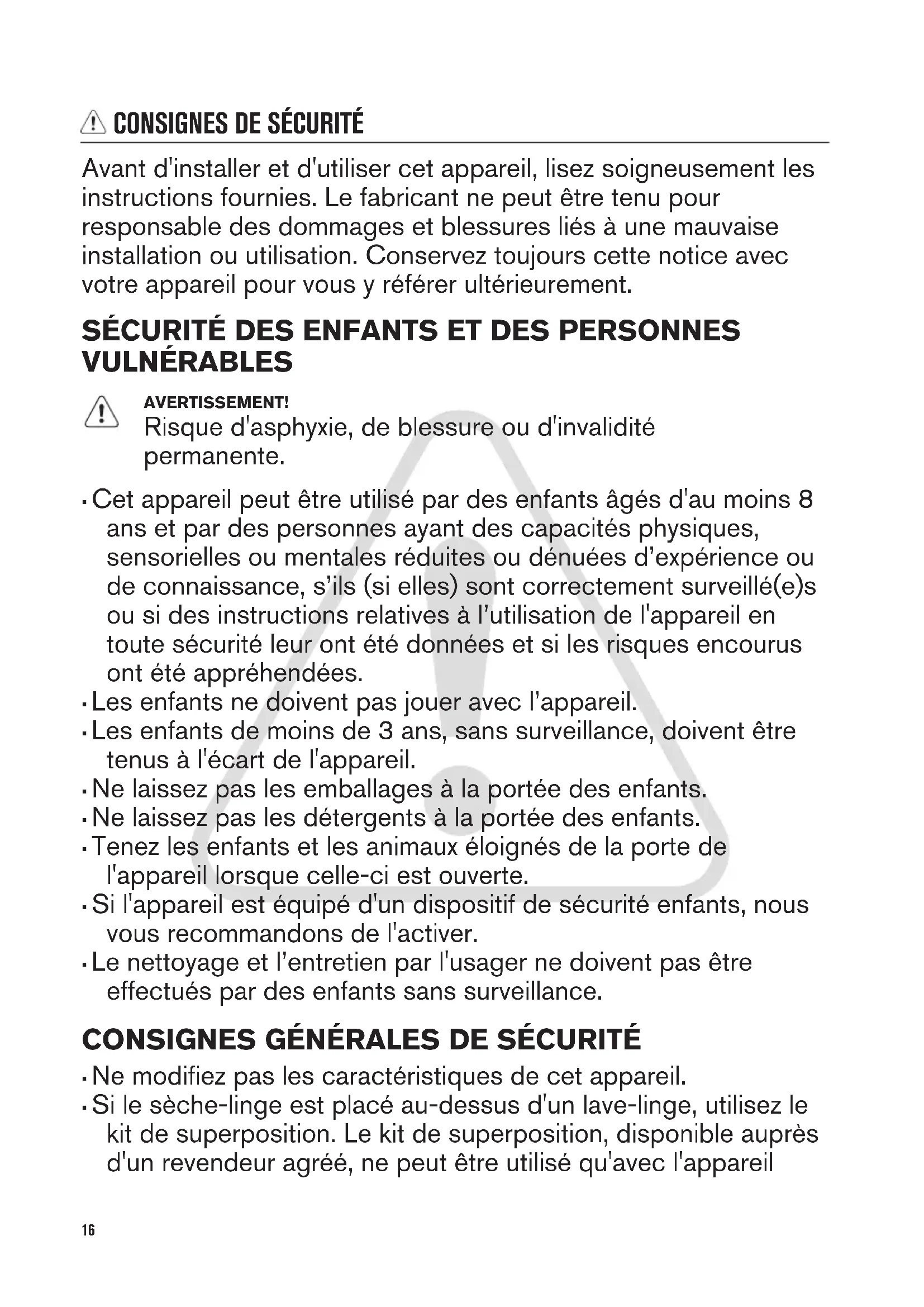 - Le nettoyage et l’entretien par l'usager ne doivent pas être effectués par des enfants sans surveillance. CONSIGNES GÉNÉRALES DE SÉCURITÉ