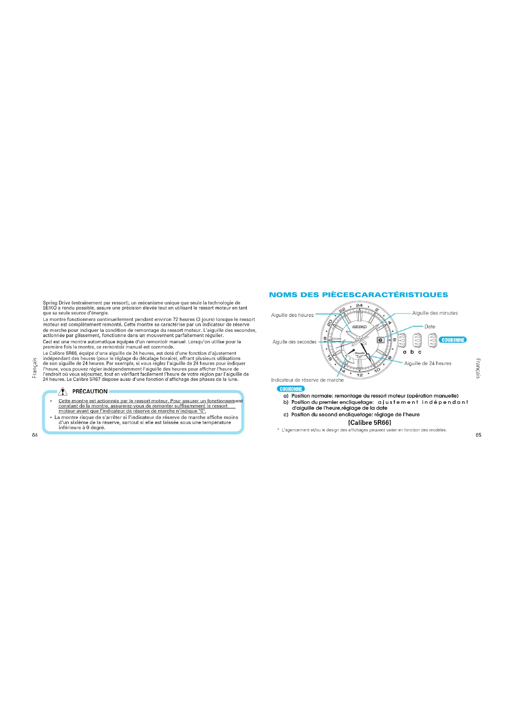 1 Caractéristiques ...................................................... 5R66 : Aiguilles des heures, minutes, secondes, 24 heures, Affichage du calendrier, Indicateur de réserve de marche 5R67 : Aiguilles des heures, minutes, secondes, Affichage des phases de la lune, Indicateur de réserve de marche 2 Fréquence de l’oscillateur à cristal .......................... 32 768 Hz (Hz = Hertz ... Cycles par seconde) 3 Perte/gain ................................................................ En deçà de 15 secondes par mois (équivalent à ±