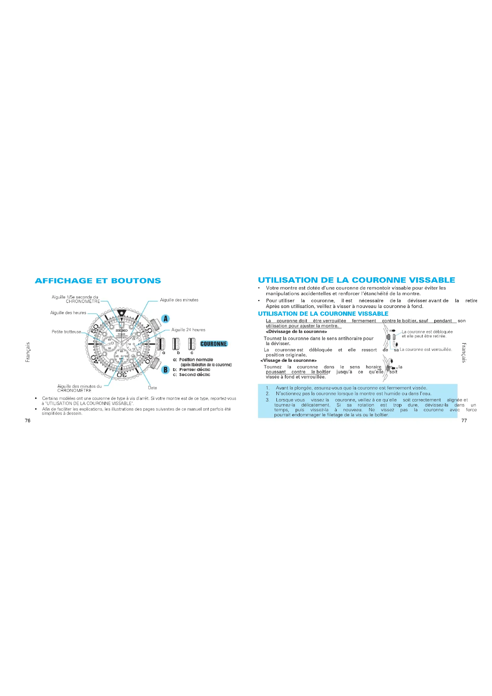 tournez-la délicatement. Si sa rotation est trop dure, dévissez-la dans un premier temps, puis vissez-la à nouveau. Ne vissez pas la couronne avec force, car ceci pourraitendommagerleletagedelavisouleboîtier. <Dévissage de la couronne> Tournezlacouronnedanslesensantihorairepour ladévisser. La couronneest débloquée et elle ressort de sa position originale. <Vissage de la couronne> Tournez la couronne dans le sens horaire en la poussant contre leboîtier jusqu’à ce qu’elle soit visséeàfondetverrouillée. Lacouronneestdébloquéeetellepeutêtreretirée.7978