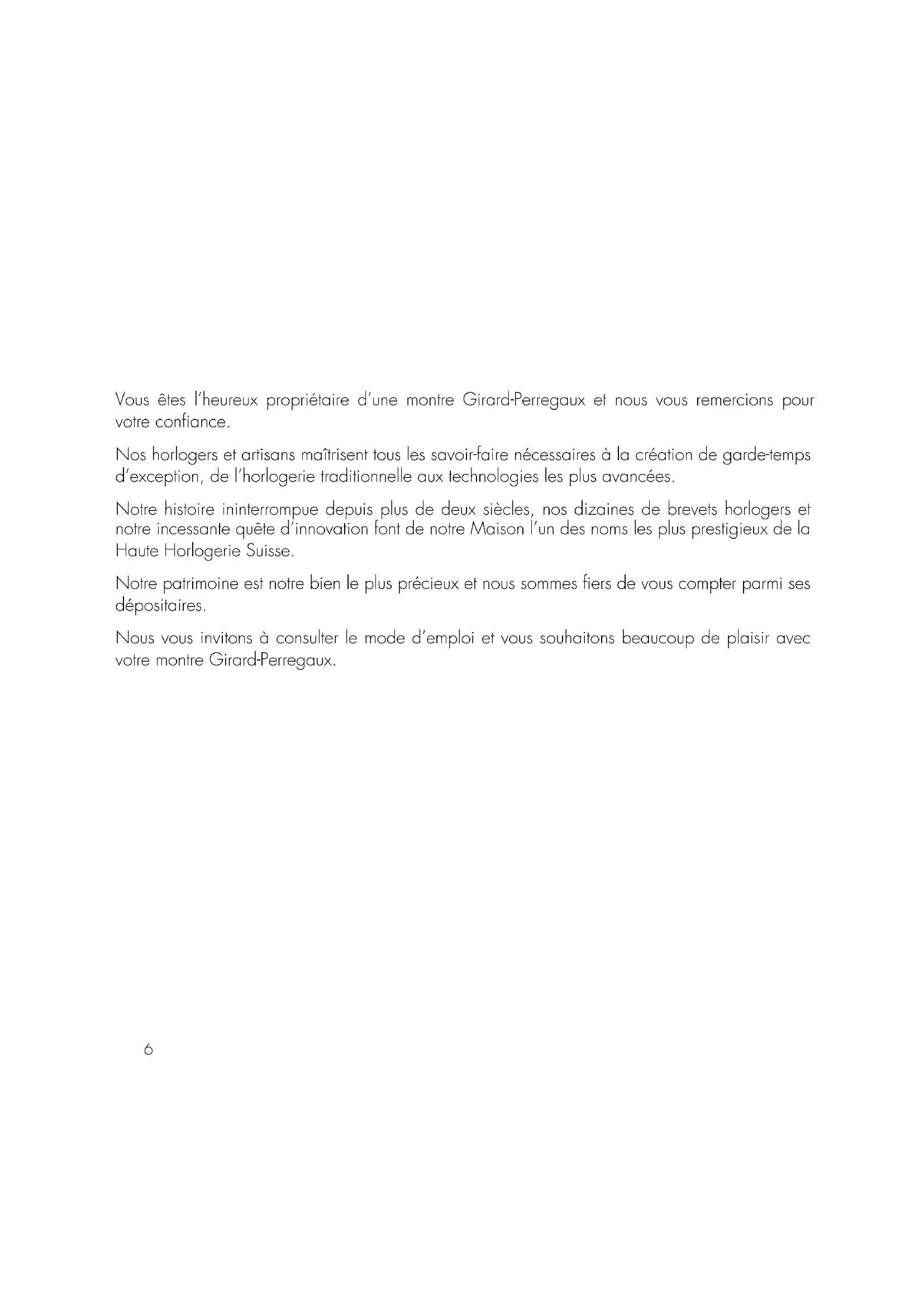 Vous êtes l’heureux propriétaire d’une montre Girard-Perregaux et nous vous remercions pour VOTREžCONżANCE Nos horlogers et artisans maîtrisent tous les savoir-faire nécessaires à la création de garde-temps d’exception, de l’horlogerie traditionnelle aux technologies les plus avancées. Notre histoire ininterrompue depuis plus de deux siècles, nos dizaines de brevets horlogers et notre incessante quête d’innovation font de notre Maison l’un des noms les plus prestigieux de la Haute Horlogerie Suisse. .OTREžPATRIMOINEžESTžNOTREžBIENžLEžPLUSžPRÃCIEUXžETžNOUSžSOMMESžżERSžDEžVOUSžCOMPTERžPARMIžSESž dépositaires. Nous vous invitons à consulter le mode d’emploi et vous souhaitons beaucoup de plaisir avec votre montre Girard-Perregaux.7 Français GARANTIE INTERNATIONALE La garantie internationale ci-après s’applique à toutes les montres Girard-Perregaux vendues par les revendeurs agréés par la marque Girard-Perregaux, présentées pour contrôle ou réparation sous garantie dans tous les pays. Conformément aux instructions de Girard-Perregaux, seuls les Centres de Réparation agréés Girard-Perregaux sont autorisés à assurer le service prévu par la garantie internationale. Tout service, réparation ou autres interventions sur votre montre qui n’auraient pas été effectués par un Centre de Réparation agréé Girard-Perregaux rendront caduque la garantie internationale. Nous garantissons votre montre contre tout défaut de conformité ainsi que contre tout défaut relevant des matériaux utilisés pendant une période de deux ans à compter de la date d’achat. Si durant cette période votre garde-temps devait présenter un de ces défauts, nous nous engageons à le remettre en état sans frais. Une fois la période de garantie écoulée, la réparation vous sera facturée en pièces et en main d’œuvre. 0OURžBÃNÃżCIERžDEžCETTEžGARANTIEžVOUSžDEVEZžPRÃSENTERžUNEžCOPIEžDUžCERTIżCATžDEžGARANTIEž dûment complété, daté, timbré et signé par un concessionnaire ou distributeur agréé. Nous vous recommandons ainsi de CONSERVERžSOIGNEUSEMENT LEžCERTIżCATžDEžGARANTIEžINTERNATIONALEž 'IRARD0ERREGAUX, car seul celui-ci rend la garantie valide. En cas de nécessité, nous vous recommandons de transmettre la montre destinée à être contrôlée ou à être réparée à l’un de nos distributeurs exclusifs ou concessionnaires agréés, lequel se chargera de l’envoyer à notre Centre de Réparation agréé le plus proche. Vous pouvez également transmettre directement votre montre à l’un de nos Centres de Réparation agréé. %NžCASžDmEXPÃDITIONžDEžVOTREžMONTRE nous vous recommandons de l’emballer très soigneusement ETžDmENžASSURERžLmENVOIžDEžMANIÂREžSÃCURISÃEžAżNžDEžPRÃVENIRžTOUTžINCIDENTžLORSžDEžSONžTRANSPORT8 Girard-Perregaux ne peut aucunement garantir l’authenticité des produits Girard-Perregaux acquis ENžDEHORSžDEžSONžRÃSEAUžDEžDISTRIBUTIONžOFżCIELžETžDEžCONCESSIONNAIRESžAGRÃÃS #ETTEžGARANTIEžVOUSžDONNEžLESžDROITSžSPÃCIżQUESžPRÃCITÃSžAUXQUELSžPEUVENTžSmAJOUTERžDmAUTRESžDROITSž variant d’un pays à l’autre. 3ONTžEXCLUSžDEžLAžGARANTIEž - Les bracelets en cuirs, en caoutchouc et en tissus; - Les altérations dues à l’usure et au vieillissement normal de la montre (en particulier les rayures, les griffures, etc.); - Les dommages occasionnés intentionnellement, résultant d’une manipulation inadéquate, d’une négligence ou d’un accident; - Les dommages résultant d’une utilisation anormale ou abusive (notamment les chocs ou écrasements); ž ž,ESžMONTRESžDONTžLEžNUMÃROžDmIDENTIżCATIONžOUžTOUTEžAUTREžMARQUEžDmIDENTIżCATIONžAURAIENTžÃTÞ volontairement effacés ou altérés; - La perte et le vol; - Les dégâts causés par des événements naturels tels qu’incendies, catastrophes naturelles et événements de guerre; ž ž4OUTEžDÃFECTUOSITÞRÃSULTANTžDEžLmADJONCTIONžDmUNžOUžPLUSIEURSžACCESSOIRESžNEžPROVENANTžPASž DEžLAžMANUFACTUREž'IRARD0ERREGAUXžENTRAÈNEžAUTOMATIQUEMENTžLAžżNžDEžLAžGARANTIE9 Français PRÉCAUTIONS D’UTILISATION ET D’ENTRETIEN Votre montre a été manufacturée avec un soin absolu et vous servira durablement si vous veillez à prendre les précautions suivantes : ž0RÃCAUTIONSžDmUTILISATIONžETžDmENTRETIEN - La couronne et les poussoirs de votre montre ne doivent pas être actionnés dans l’eau. Si votre montre possède une couronne vissée, veillez à ce qu’elle n’entre à aucun moment en contact avec de l’eau lorsque la couronne est dévissée; - Evitez les chocs thermiques ainsi que l’exposition de votre montre à des températures extrêmes, inférieures à 0° ou supérieures à 60 ° (sauna, hammam); - Evitez toute utilisation de produits corrosifs/chimiques lors du nettoyage de votre montre ; - Evitez tout contact avec certaines substances chimiques (essence, diluants, parfums, produits DEžNETTOYAGEžCOLLESžPEINTURESžETCžCECIžAżNžDEžPRÃVENIRžUNEžDÃTÃRIORATIONžDEžVOTREžMONTREž et de son bracelet en cuir; - Evitez toute exposition de votre montre à un champ magnétique puissant (aimant, haut- parleurs, etc); - Evitez les coups violents; - Evitez de laisser votre montre immobile pendant de longues périodes. Seul un port régulier ÃVITEžQUEžLESžHUILESžCONTENUESžDANSžLEžMOUVEMENTžNEžSEžżGENT ž ž.EžJAMAISžTENTERžDmOUVRIRžSOIMÄMEžLEžBOÈTIERžDEžVOTREžMONTRE - Après un bain de mer, rincez votre montre à l’eau claire, évitez de vous baigner avec un BRACELETžENžCUIRžCECIžAżNžDEžPRÃVENIRžUNEžUSUREžACCÃLÃRÃE ž3ERVICEžDEžMAINTENANCE $ÂSžLORSžETžAżNžQUEžVOTREžMONTREžVOUSžOFFREžAPRÂSžDESžANNÃESžDmUSAGEžLAžPRÃCISIONžQUEžVOUSžÄTESž LÃGITIMEMENTžENžDROITžDmATTENDREž'IRARD0ERREGAUXžVOUSžRECOMMANDEžDEžCONżERžVOTREžMONTREžTOUSž LESžžºžžANSžºžLmUNžDEžSES