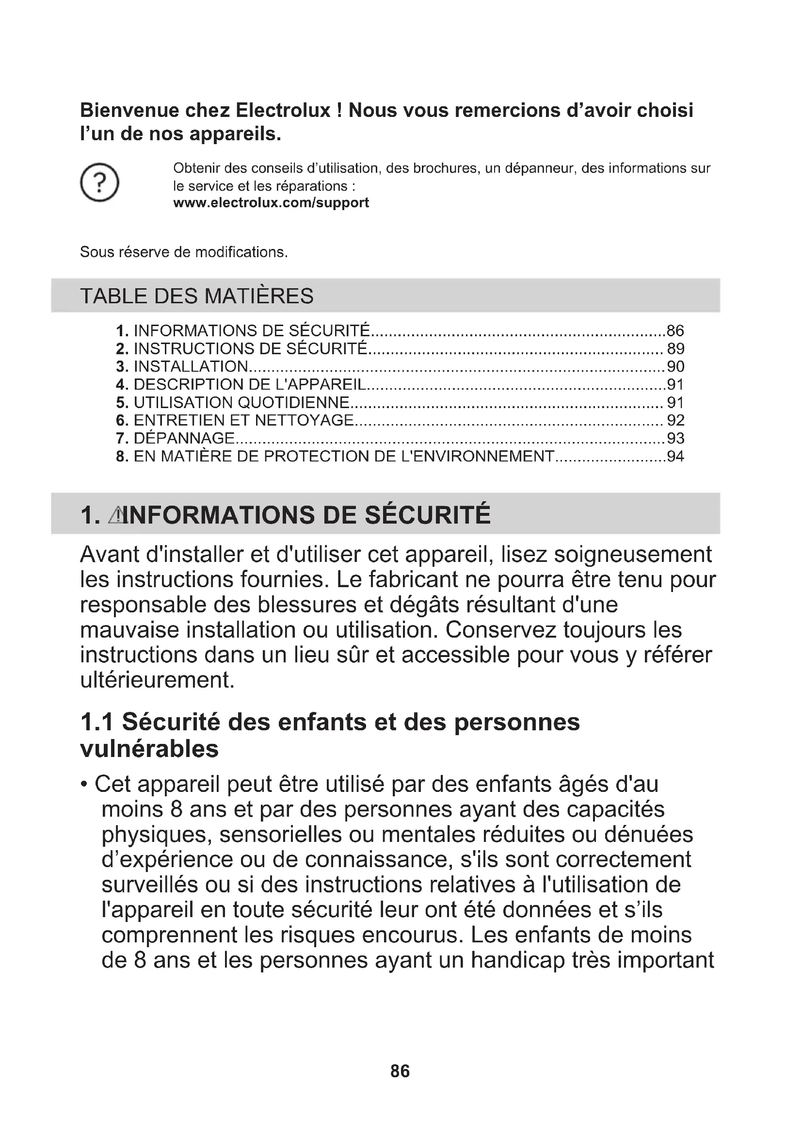 - Cet appareil peut être utilisé par des enfants âgés d'au moins 8 ans et par des personnes ayant des capacités physiques, sensorielles ou mentales réduites ou dénuées d’expérience ou de connaissance, s'ils sont correctement surveillés ou si des instructions relatives à l'utilisation de l'appareil en toute sécurité leur ont été données et s’ils comprennent les risques encourus. Les enfants de moins de 8 ans et les personnes ayant un handicap très important 86et complexe doivent être tenus à l'écart de l’appareil, à moins d'être surveillés en permanence.
