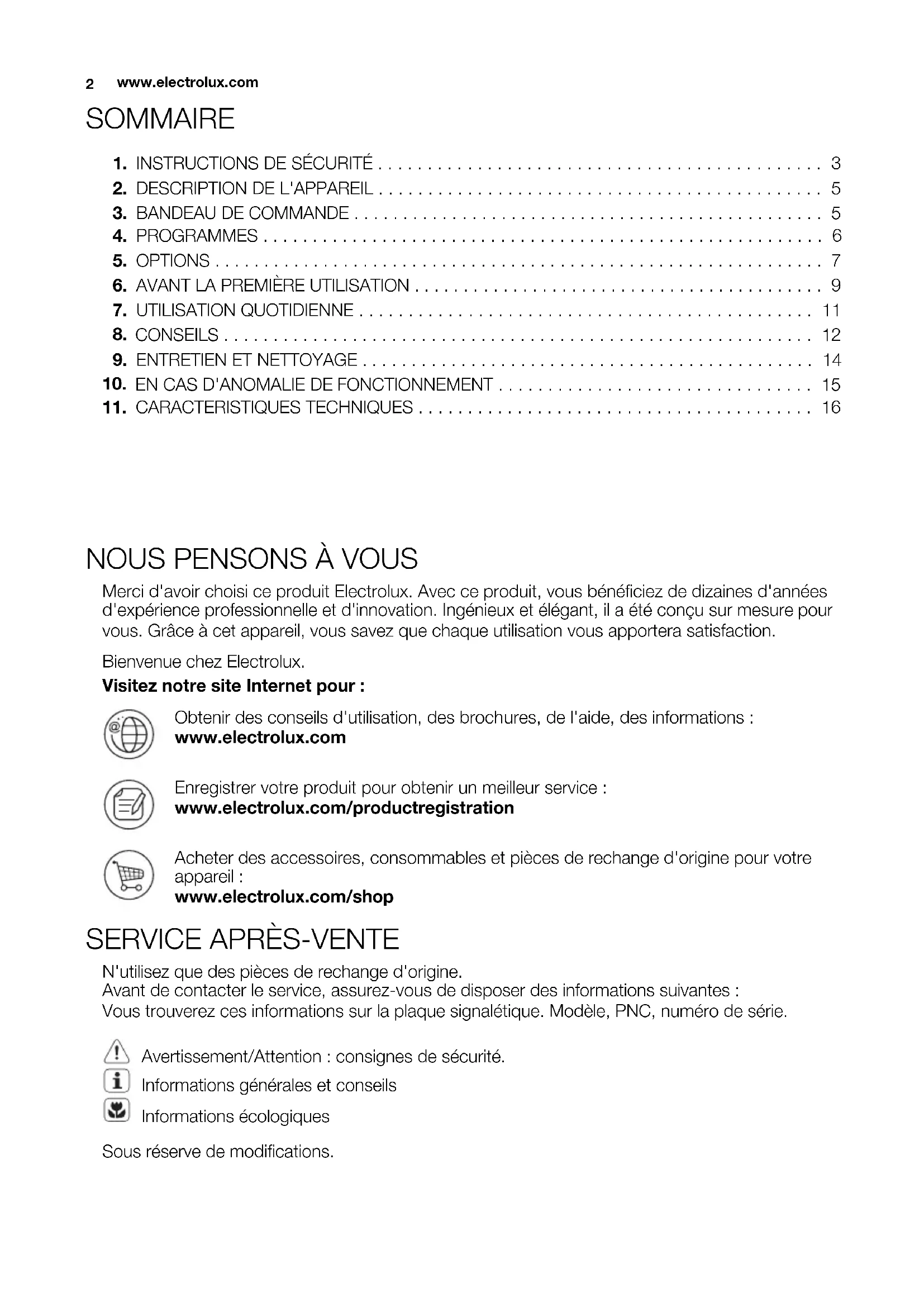 Merci d'avoir choisi ce produit Electrolux. Avec ce produit, vous bénéficiez de dizaines d'années d'expérience professionnelle et d'innovation. Ingénieux et élégant, il a été conçu sur mesure pour vous. Grâce à cet appareil, vous savez que chaque utilisation vous apportera satisfaction. Bienvenue chez Electrolux. Visitez notre site Internet pour : Obtenir des conseils d'utilisation, des brochures, de l'aide, des informations : www.electrolux.com Enregistrer votre produit pour obtenir un meilleur service : www.electrolux.com/productregistration Acheter des accessoires, consommables et pièces de rechange d'origine pour votre appareil : www.electrolux.com/shop