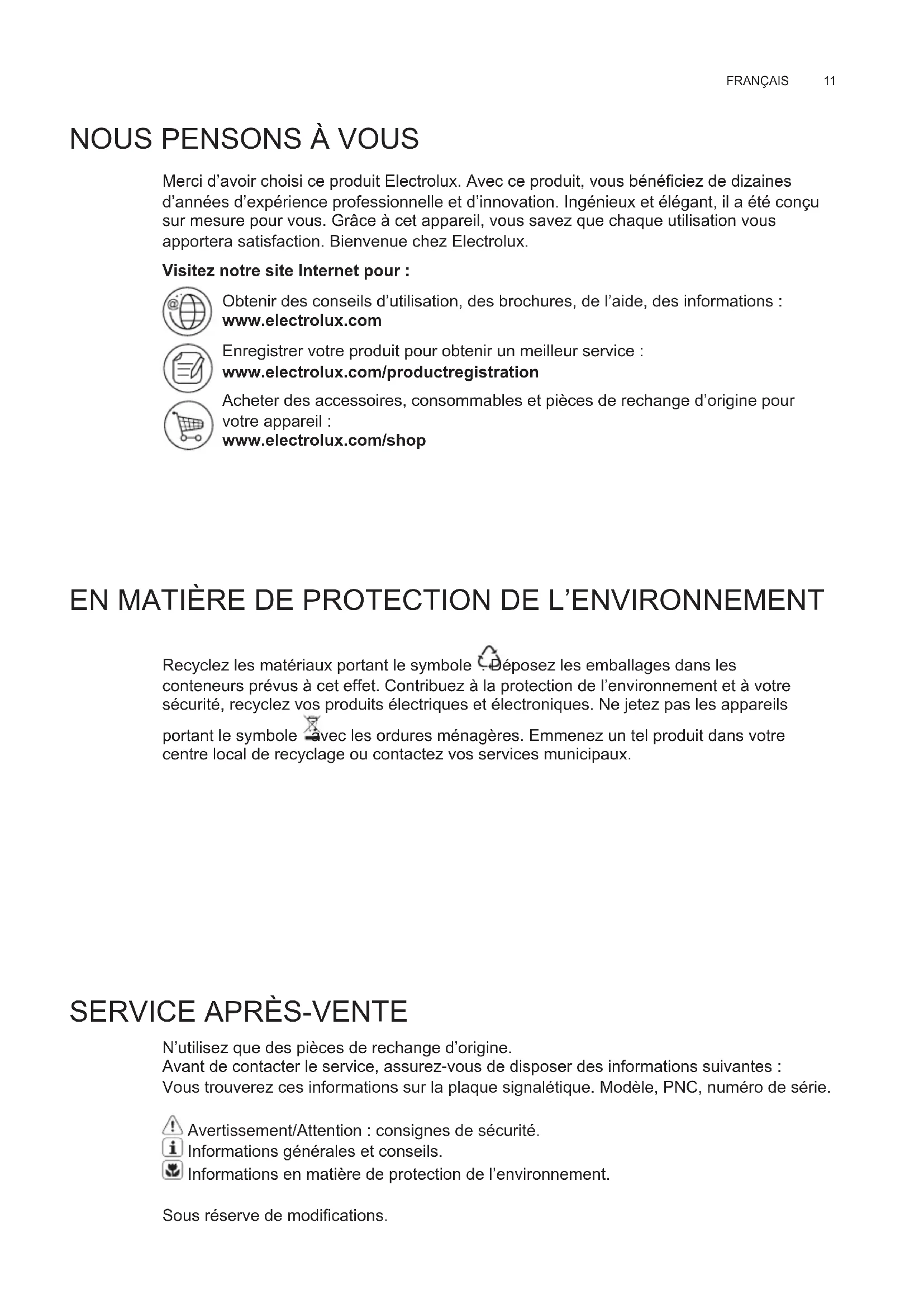 N’utilisez que des pièces de rechange d’origine. Avant de contacter le service, assurez-vous de disposer des informations suivantes : Vous trouverez ces informations sur la plaque signalétique. Modèle, PNC, numéro de série. Avertissement/Attention : consignes de sécurité. Informations générales et conseils. Informations en matière de protection de l’environnement. Sous réserve de modifications. FR MANUEL D’UTILISATIONwww.electrolux.com