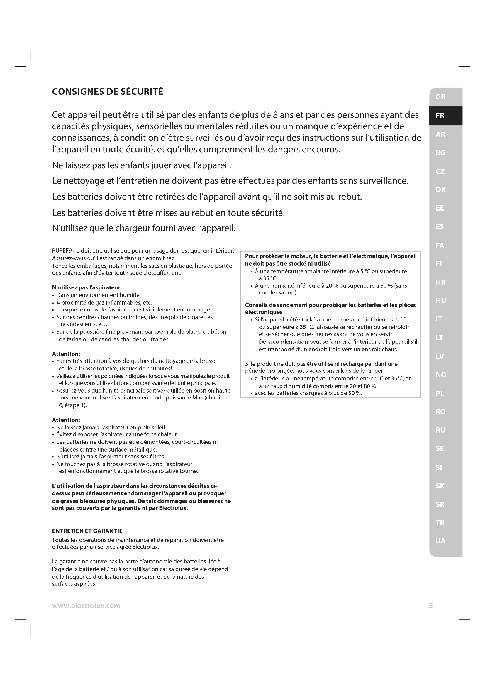Toutes les opérations de maintenance et de réparation doivent être eectuées par un service agréé Electrolux. La garantie ne couvre paslaperte d’autonomiedesbatteriesliéeà l’âgede la batterieet / ouà son utilisationcarsaduréedeviedépend dela fréquenced’utilisationdel’appareilet delanaturedes surfacesaspirées.TR