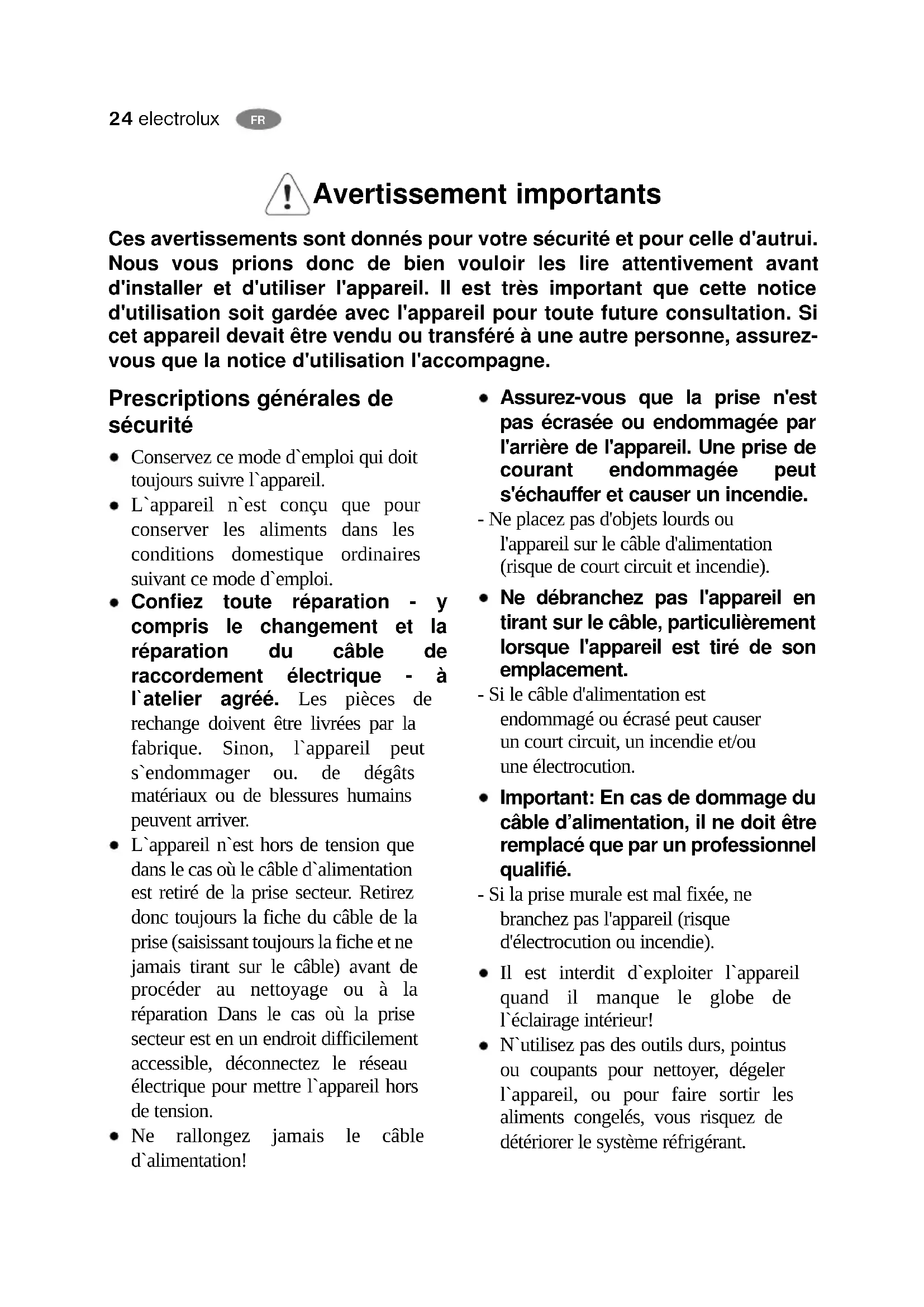 Prescriptions générales de sécurité Conservez ce mode d`emploi qui doit toujours suivre l`appareil. L`appareil n`est conçu que pour conserver les aliments dans les conditions domestique ordinaires suivant ce mode d`emploi. Confiez toute réparation - y compris le changement et la réparation du câble de raccordement électrique - à l`atelier agréé. Les pièces de rechange doivent être livrées par la fabrique. Sinon, l`appareil peut s`endommager ou. de dégâts matériaux ou de blessures humains peuvent arriver. L`appareil n`est hors de tension que dans le cas où le câble d`alimentation est retiré de la prise secteur. Retirez donc toujours la fiche du câble de la prise (saisissant toujours la fiche et ne jamais tirant sur le câble) avant de procéder au nettoyage ou à la réparation Dans le cas où la prise secteur est en un endroit difficilement accessible, déconnectez le réseau électrique pour mettre l`appareil hors de tension. Ne rallongez jamais le câble d`alimentation! Assurez-vous que la prise n'est pas écrasée ou endommagée par l'arrière de l'appareil. Une prise de courant endommagée peut s'échauffer et causer un incendie. - Ne placez pas d'objets lourds ou l'appareil sur le câble d'alimentation (risque de court circuit et incendie). Ne débranchez pas l'appareil en tirant sur le câble, particulièrement lorsque l'appareil est tiré de son emplacement. - Si le câble d'alimentation est endommagé ou écrasé peut causer un court circuit, un incendie et/ou une électrocution. Important: En cas de dommage du câble d’alimentation, il ne doit être remplacé que par un professionnel qualifié. - Si la prise murale est mal fixée, ne branchez pas l'appareil (risque d'électrocution ou incendie). Il est interdit d`exploiter l`appareil quand il manque le globe de l`éclairage intérieur! N`utilisez pas des outils durs, pointus ou coupants pour nettoyer, dégeler l`appareil, ou pour faire sortir les aliments congelés, vous risquez de détériorer le système réfrigérant. Avertissement importants Ces avertissements sont donnés pour votre sécurité et pour celle d'autrui. Nous vous prions donc de bien vouloir les lire attentivement avant d'installer et d'utiliser l'appareil. Il est très important que cette notice d'utilisation soit gardée avec l'appareil pour toute future consultation. Si cet appareil devait être vendu ou transféré à une autre personne, assurez- vous que la notice d'utilisation l'accompagne.electrolux 25
