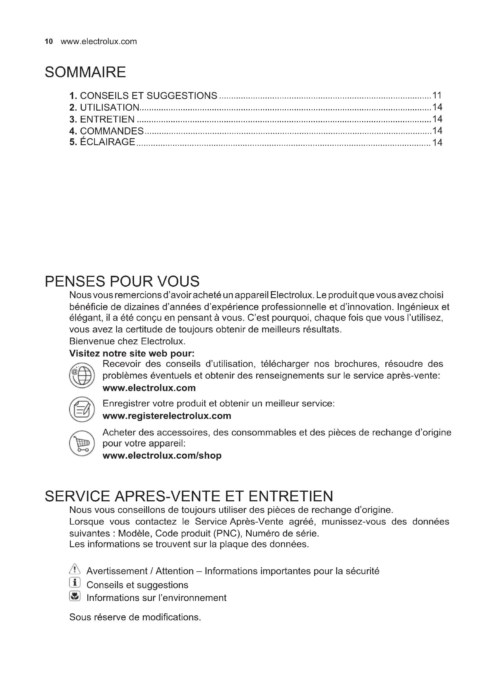 Nous vous remercions d’avoir acheté un appareil Electrolux. Le produit que vous avez choisi bénécie de dizaines d’années d’expérience professionnelle et d’innovation. Ingénieux et élégant, il a été conçu en pensant à vous. C’est pourquoi, chaque fois que vous l’utilisez, vous avez la certitude de toujours obtenir de meilleurs résultats. Bienvenue chez Electrolux. Visitez notre site web pour: Recevoir des conseils d’utilisation, télécharger nos brochures, résoudre des problèmes éventuels et obtenir des renseignements sur le service après-vente: www.electrolux.com Enregistrer votre produit et obtenir un meilleur service: www.registerelectrolux.com Acheter des accessoires, des consommables et des pièces de rechange d’origine pour votre appareil: www.electrolux.com/shop