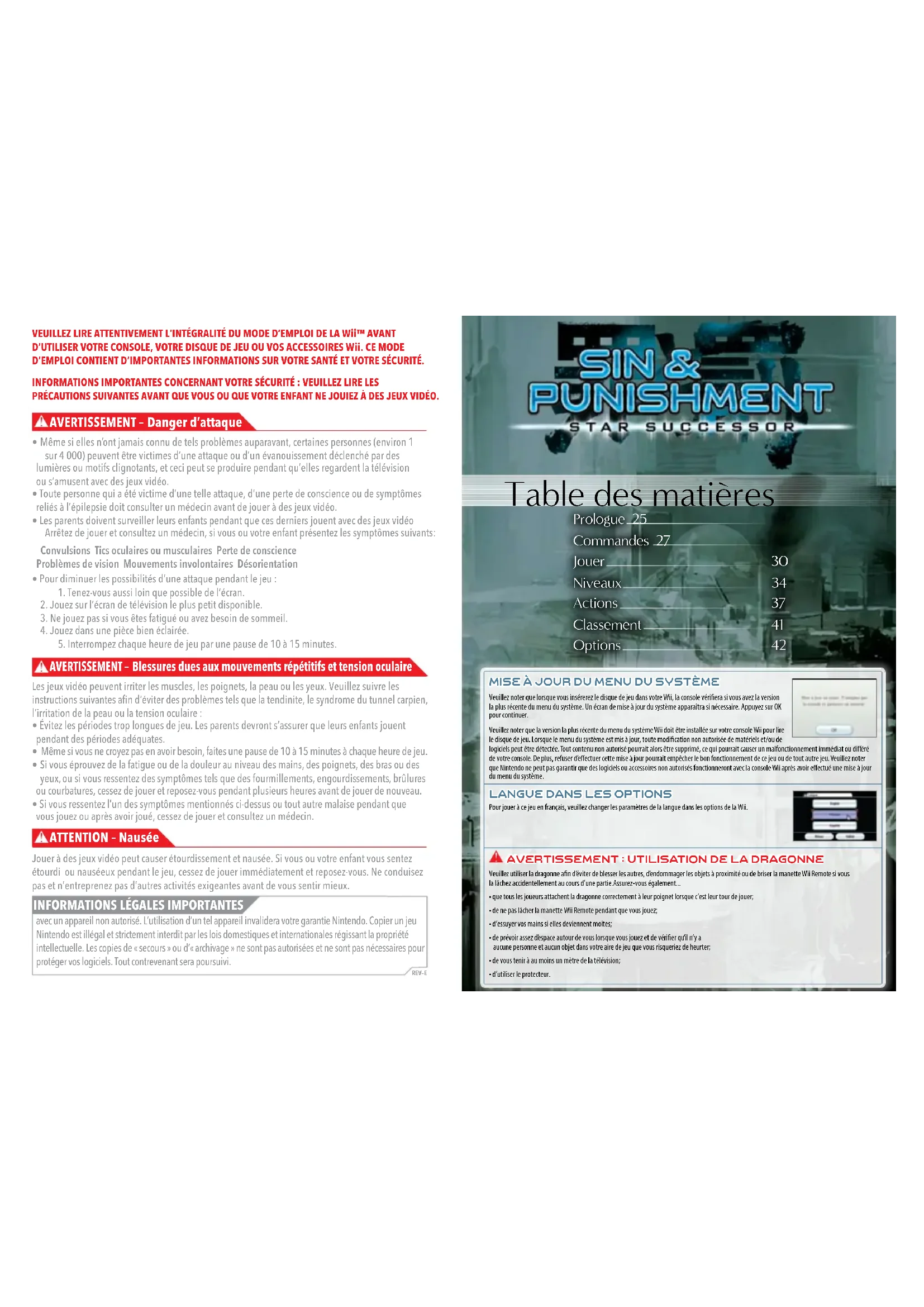 Blessures dues aux mouvements répétitifs et tension oculaire AVERTISSEMENT – Danger d’attaque Table des matières Prologue 25 Commandes 27 Jouer 30 Niveaux 34 Actions 37 Classement 41 Options 42 MISE À JOUR DU MENU DU SYSTÈME Veuillez noter que lorsque vous insérerez le disque de jeu dans votre Wii, la console vériera si vous avez la version la plus récente du menu du système. Un écran de mise à jour du système apparaîtra si nécessaire. Appuyez sur OK pour continuer. Veuillez noter que la version la plus récente du menu du système Wii doit être installée sur votre console Wii pour lire le disque de jeu. Lorsque le menu du système est mis à jour, toute modication non autorisée de matériels et/ou de logiciels peut être détectée. Tout contenu non autorisé pourrait alors être supprimé, ce qui pourrait causer un malfonctionnement immédiat ou diéré de votre console. De plus, refuser d’eectuer cette mise à jour pourrait empêcher le bon fonctionnement de ce jeu ou de tout autre jeu. Veuillez noter que Nintendo ne peut pas garantir que des logiciels ou accessoires non autorisés fonctionneront avec la console Wii après avoir eectué une mise à jour du menu du système.