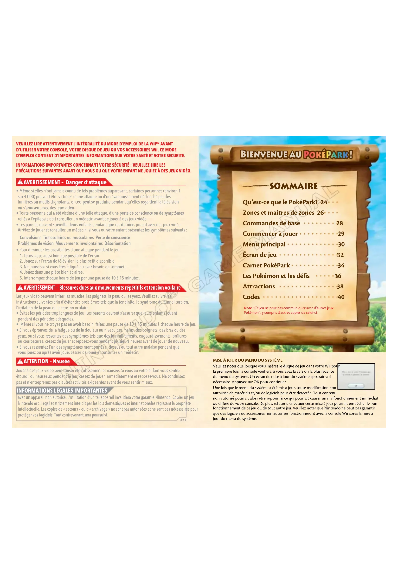 Blessures dues aux mouvements répétitifs et tension oculaire AVERTISSEMENT – Danger d’attaque MISE À JOUR DU MENU DU SYSTÈME Veuillez noter que lorsque vous insérez le disque de jeu dans votre Wii pour la première fois, la console vérifiera si vous avez la version la plus récente du menu du système. Un écran de mise à jour du système apparaîtra si nécessaire. Appuyez sur OK pour continuer.Une fois que le menu du système a été mis à jour, toute modification non autorisée de matériels et/ou de logiciels peut être détectée. Tout contenu non autorisé pourrait alors être supprimé, ce qui pourrait causer un malfonctionnement immédiat ou différé de votre console. De plus, refuser d’effectuer cette mise à jour pourrait empêcher le bon fonctionnement de ce jeu ou de tout autre jeu. Veuillez noter que Nintendo ne peut pas garantir que des logiciels ou accessoires non autorisés fonctionneront avec la console Wii après la mise à jour du menu du système. sommaire Qu’est-ce que le PokéPark? 24 Zones et maîtres de zones 26 Commandes de base 28 Commencer à jouer 29 Menu principal 30 Écran de jeu 32 Carnet PokéPark 34 Les Pokémon et les défis 36 Attractions 38 Codes 40 Note : Ce jeu ne peut pas communiquer avec d’autres jeux Pokémon™, y compris d’autres copies de celui-ci. Bienvenue au PokéPark PokePark_Manual_USA.indd 22-23 8/24/10 1:50 PM24