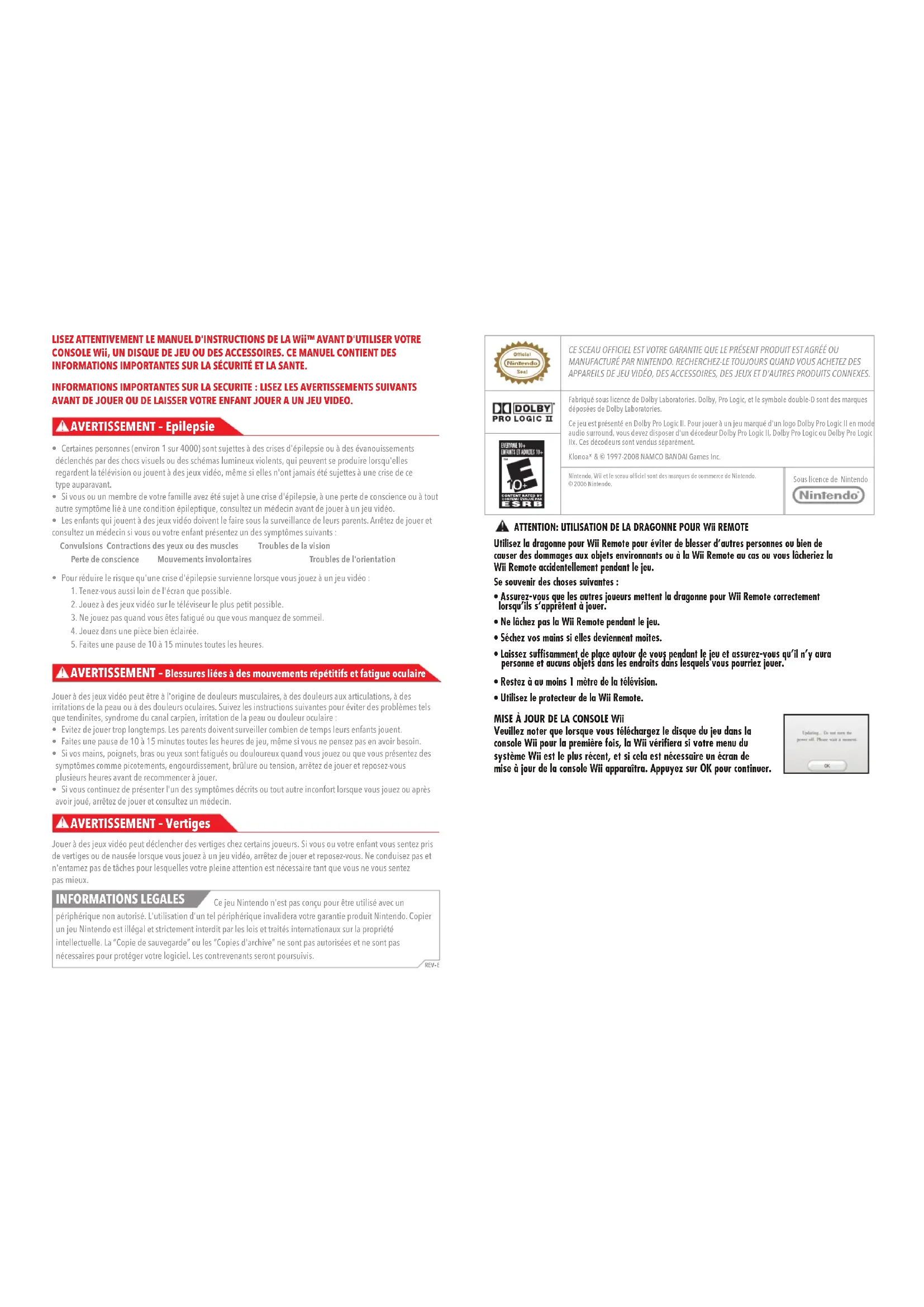 Jouer à des jeux vidéo peut déclencher des vertiges chez certains joueurs. Si vous ou votre enfant vous sentez pris de vertiges ou de nausée lorsque vous jouez à un jeu vidéo, arrêtez de jouer et reposez-vous. Ne conduisez pas et n'entamez pas de tâches pour lesquelles votre pleine attention est nécessaire tant que vous ne vous sentez pas mieux. Ce jeu Nintendo n'est pas conçu pour être utilisé avec un périphérique non autorisé. L'utilisation d'un tel périphérique invalidera votre garantie produit Nintendo. Copier un jeu Nintendo est illégal et strictement interdit par les lois et traités internationaux sur la propriété intellectuelle. La “Copie de sauvegarde” ou les “Copies d'archive” ne sont pas autorisées et ne sont pas nécessaires pour protéger votre logiciel. Les contrevenants seront poursuivis. REV–E INFORMATIONS LEGALES AVERTISSEMENT – Epilepsie AVERTISSEMENT – Vertiges AVERTISSEMENT – Blessures liées à des mouvements répétitifs et fatigue oculaire CE SCEAU OFFICIEL EST VOTRE GARANTIE QUE LE PRÉSENT PRODUIT EST AGRÉÉ OU MANUFACTURÉ PAR NINTENDO. RECHERCHEZ-LE TOUJOURS QUAND VOUS ACHETEZ DES APPAREILS DE JEU VIDÉO, DES ACCESSOIRES, DES JEUX ET D'AUTRES PRODUITS CONNEXES. Fabriqué sous licence de Dolby Laboratories. Dolby, Pro Logic, et le symbole double-D sont des marques déposées de Dolby Laboratories. Ce jeu est présenté en Dolby Pro Logic II. Pour jouer à un jeu marqué d'un logo Dolby Pro Logic II en mode audio surround, vous devez disposer d'un décodeur Dolby Pro Logic II, Dolby Pro Logic ou Dolby Pro Logic