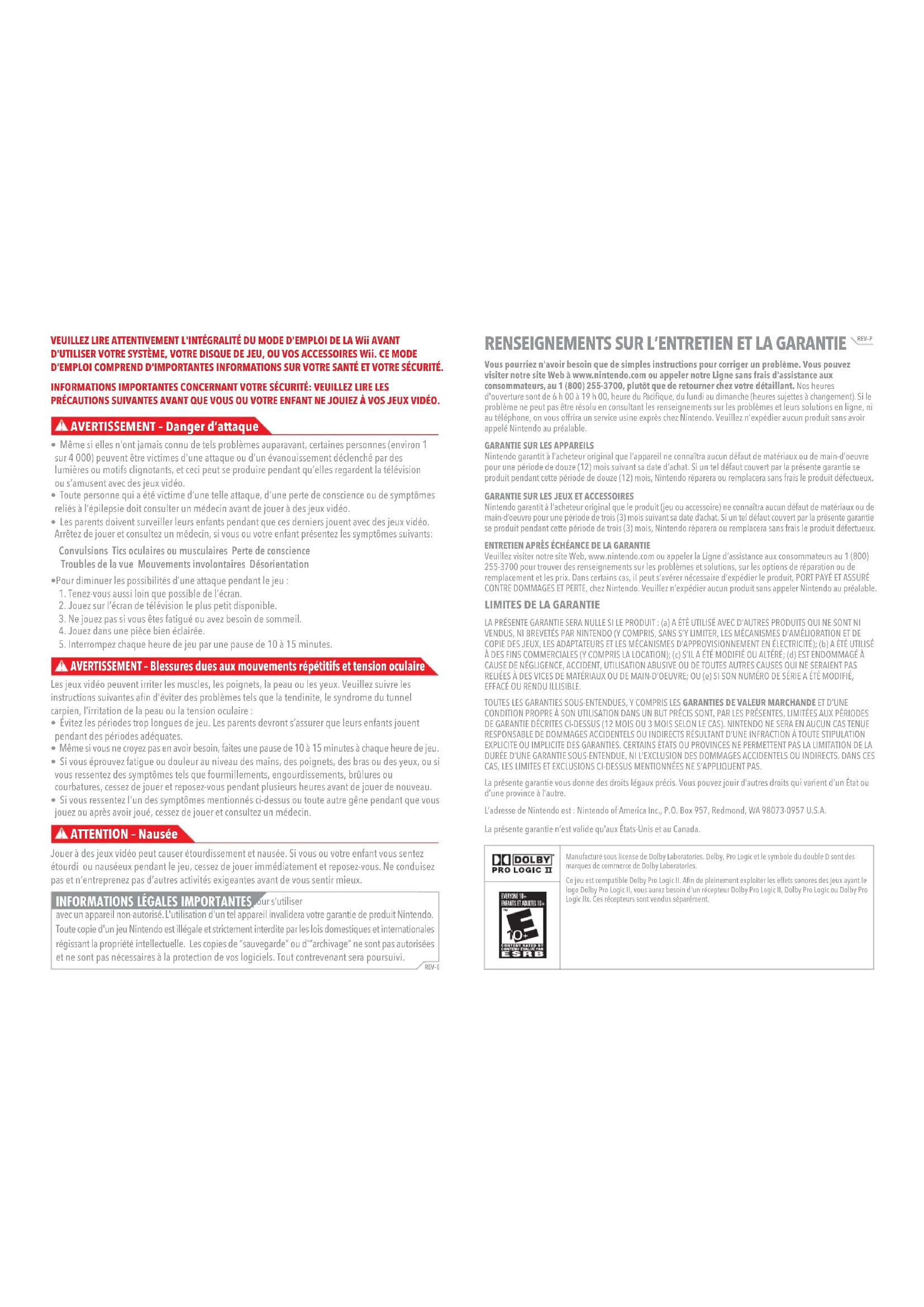 - Si vous ressentez l'un des symptômes mentionnés ci-dessus ou toute autre gêne pendant que vous jouez ou après avoir joué, cessez de jouer et consultez un médecin. ATTENTION – Nausée Jouer à des jeux vidéo peut causer étourdissement et nausée. Si vous ou votre enfant vous sentez étourdi ou nauséeux pendant le jeu, cessez de jouer immédiatement et reposez-vous. Ne conduisez pas et n’entreprenez pas d’autres activités exigeantes avant de vous sentir mieux. RENSEIGNEMENTS SUR L’ENTRETIEN ET LA GARANTIE Vous pourriez n'avoir besoin que de simples instructions pour corriger un problème. Vous pouvez visiter notre site Web à www.nintendo.com ou appeler notre Ligne sans frais d'assistance aux consommateurs, au 1 (800) 255-3700, plutôt que de retourner chez votre détaillant. Nos heures d'ouverture sont de 6 h 00 à 19 h 00, heure du Pacifique, du lundi au dimanche (heures sujettes à changement). Si le problème ne peut pas être résolu en consultant les renseignements sur les problèmes et leurs solutions en ligne, ni au téléphone, on vous offrira un service usine exprès chez Nintendo. Veuillez n'expédier aucun produit sans avoir appelé Nintendo au préalable.