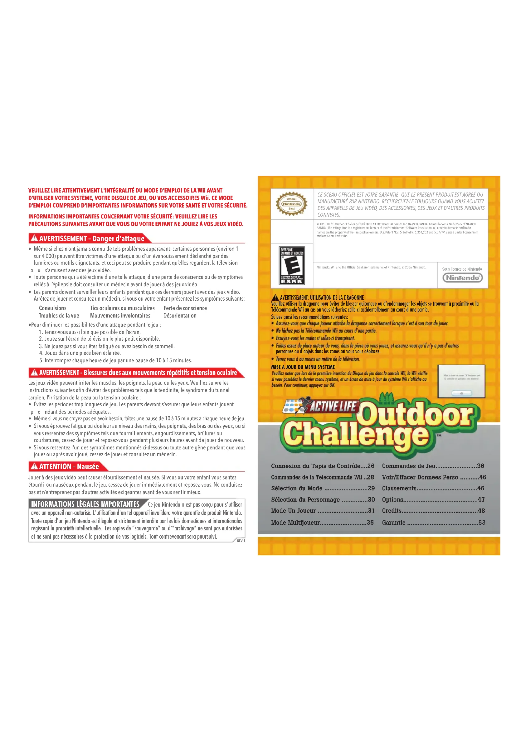 - Si vous ressentez l'un des symptômes mentionnés ci-dessus ou toute autre gêne pendant que vous jouez ou après avoir joué, cessez de jouer et consultez un médecin. ATTENTION – Nausée Jouer à des jeux vidéo peut causer étourdissement et nausée. Si vous ou votre enfant vous sentez étourdi ou nauséeux pendant le jeu, cessez de jouer immédiatement et reposez-vous. Ne conduisez pas et n’entreprenez pas d’autres activités exigeantes avant de vous sentir mieux. REV–E Ce jeu Nintendo n'est pas conçu pour s'utiliser avec un appareil non-autorisé. L'utilisation d'un tel appareil invalidera votre garantie de produit Nintendo. Toute copie d'un jeu Nintendo est illégale et strictement interdite par les lois domestiques et internationales régissant la propriété intellectuelle. Les copies de “sauvegarde” ou d'“archivage” ne sont pas autorisées et ne sont pas nécessaires à la protection de vos logiciels. Tout contrevenant sera poursuivi.