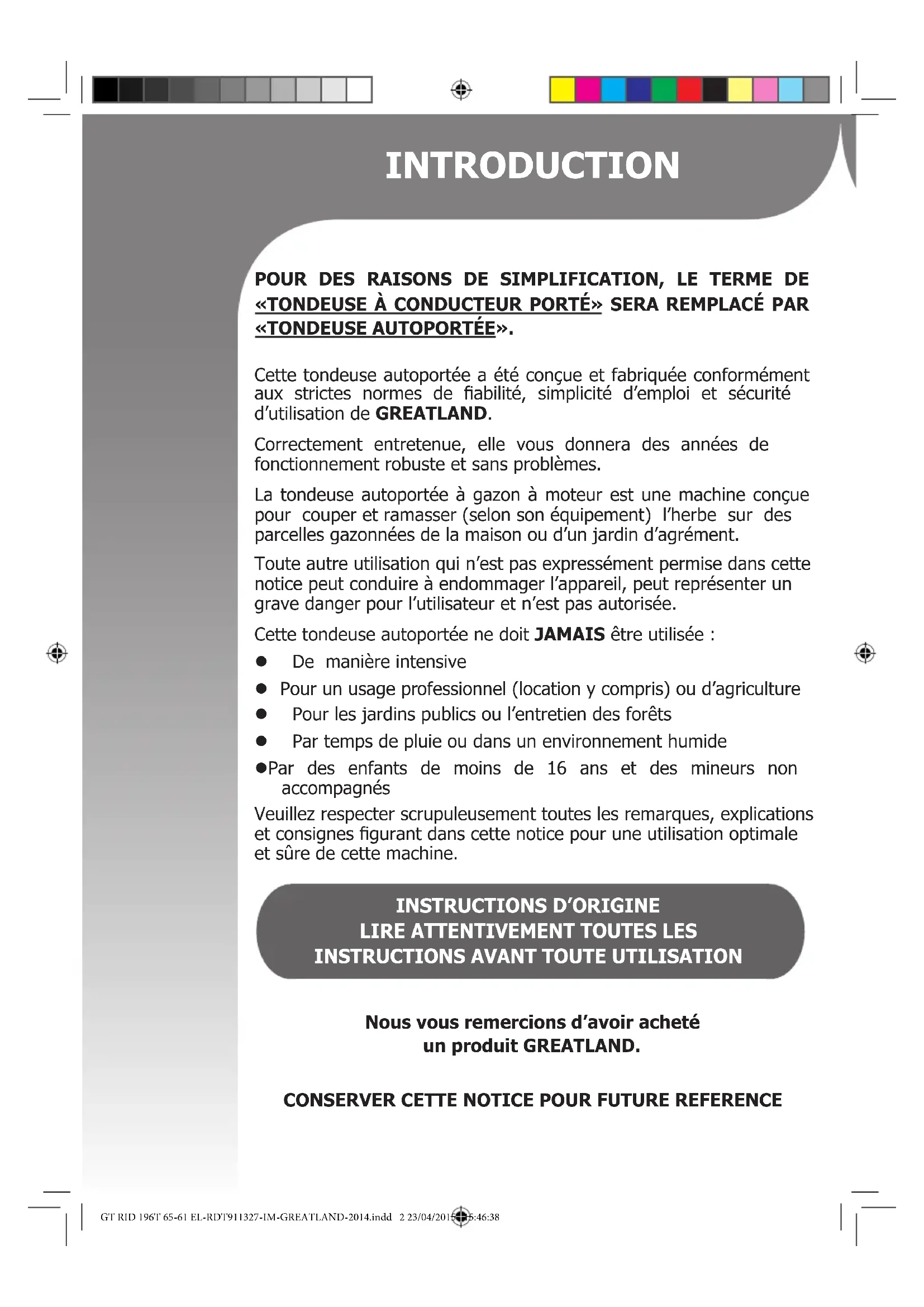 «TONDEUSE AUTOPORTÉE». Cette tondeuse autoportée a été conçue et fabriquée conformément aux strictes normes de abilité, simplicité d’emploi et sécurité d’utilisation de GREATLAND. Correctement entretenue, elle vous donnera des années de fonctionnement robuste et sans problèmes. La tondeuse autoportée à gazon à moteur est une machine conçue pour couper et ramasser (selon son équipement) l’herbe sur des parcelles gazonnées de la maison ou d’un jardin d’agrément. Toute autre utilisation qui n’est pas expressément permise dans cette notice peut conduire à endommager l’appareil, peut représenter un grave danger pour l’utilisateur et n’est pas autorisée. Cette tondeuse autoportée ne doit JAMAIS être utilisée : l De manière intensive l Pour un usage professionnel (location y compris) ou d’agriculture l Pour les jardins publics ou l’entretien des forêts l Par temps de pluie ou dans un environnement humide l Par des enfants de moins de 16 ans et des mineurs non accompagnés Veuillez respecter scrupuleusement toutes les remarques, explications et consignes gurant dans cette notice pour une utilisation optimale et sûre de cette machine. Nous vous remercions d’avoir acheté un produit GREATLAND.