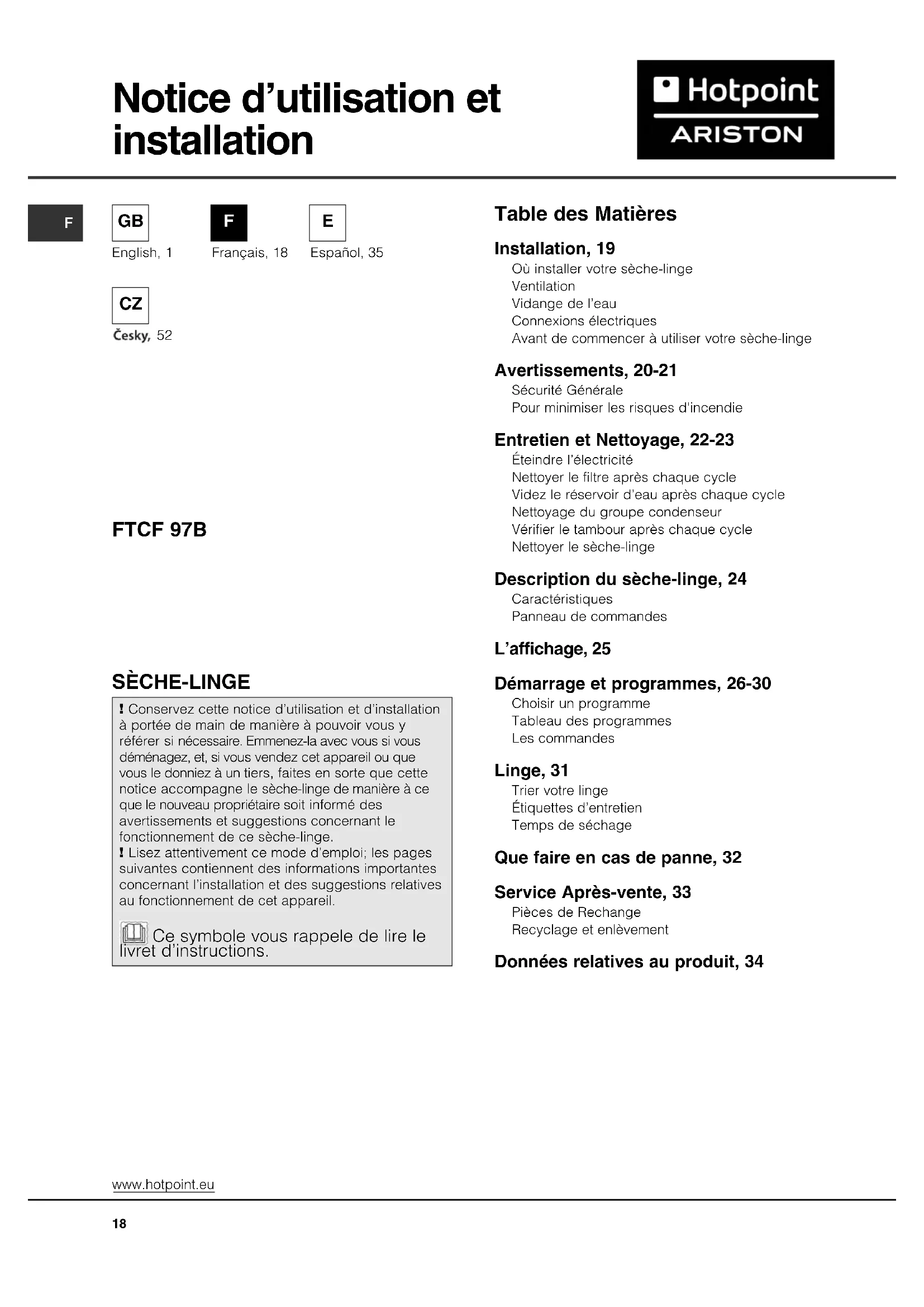 Français, 18 ! Conservez cette notice d’utilisation et d’installation à portée de main de manière à pouvoir vous y référer si nécessaire. Emmenez-la avec vous si vous déménagez, et, si vous vendez cet appareil ou que vous le donniez à un tiers, faites en sorte que cette notice accompagne le sèche-linge de manière à ce que le nouveau propriétaire soit informé des avertissements et suggestions concernant le fonctionnement de ce sèche-linge. ! Lisez attentivement ce mode d’emploi; les pages suivantes contiennent des informations importantes concernant l’installation et des suggestions relatives au fonctionnement de cet appareil. Ce symbole vous rappele de lire le livret d’instructions. www.hotpoint.eu
