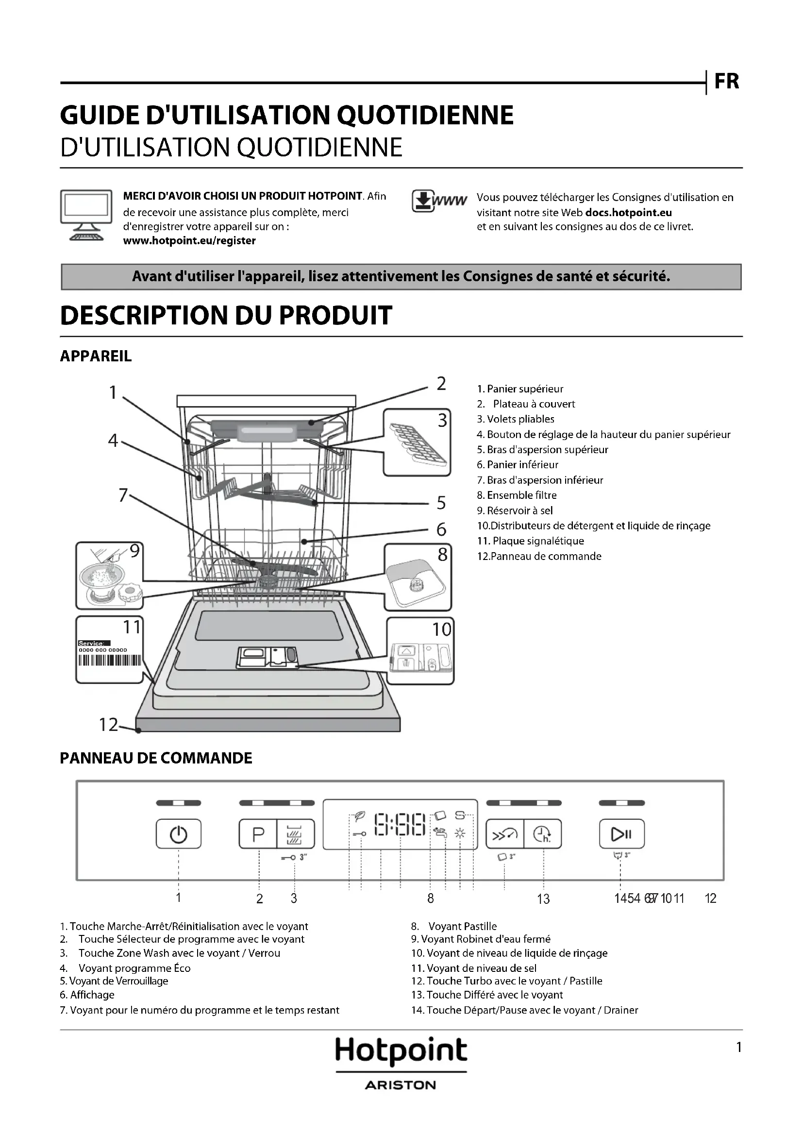 D'UTILISATION QUOTIDIENNE MERCI D'AVOIR CHOISI UN PRODUIT HOTPOINT. Afin de recevoir une assistance plus complète, merci d'enregistrer votre appareil sur on :www.hotpoint.eu/registerVous pouvez télécharger les Consignes d'utilisation en visitant notre site Web docs.hotpoint.eu et en suivant les consignes au dos de ce livret. Avant d'utiliser l'appareil, lisez attentivement les Consignes de santé et sécurité.