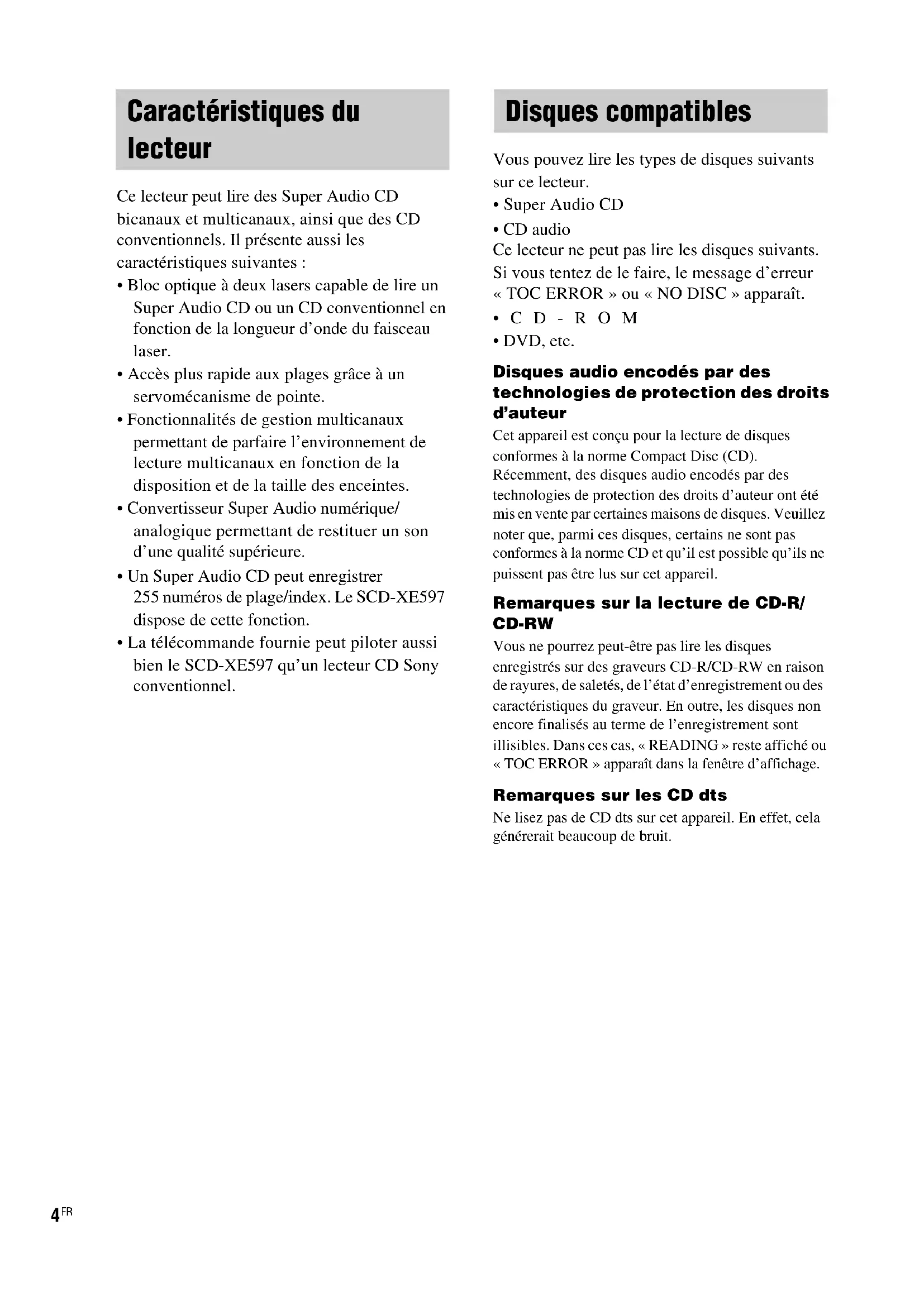 - DVD, etc. Disques audio encodés par des technologies de protection des droits d’auteur Cet appareil est conçu pour la lecture de disques conformes à la norme Compact Disc (CD). Récemment, des disques audio encodés par des technologies de protection des droits d’auteur ont été mis en vente par certaines maisons de disques. Veuillez noter que, parmi ces disques, certains ne sont pas conformes à la norme CD et qu’il est possible qu’ils ne puissent pas être lus sur cet appareil. Remarques sur la lecture de CD-R/ CD-RW Vous ne pourrez peut-être pas lire les disques enregistrés sur des graveurs CD-R/CD-RW en raison de rayures, de saletés, de l’état d’enregistrement ou des caractéristiques du graveur. En outre, les disques non encore finalisés au terme de l’enregistrement sont illisibles. Dans ces cas, « READING » reste affiché ou « TOC ERROR » apparaît dans la fenêtre d’affichage. Remarques sur les CD dts Ne lisez pas de CD dts sur cet appareil. En effet, cela générerait beaucoup de bruit. Caractéristiques du lecteur Disques compatibles5