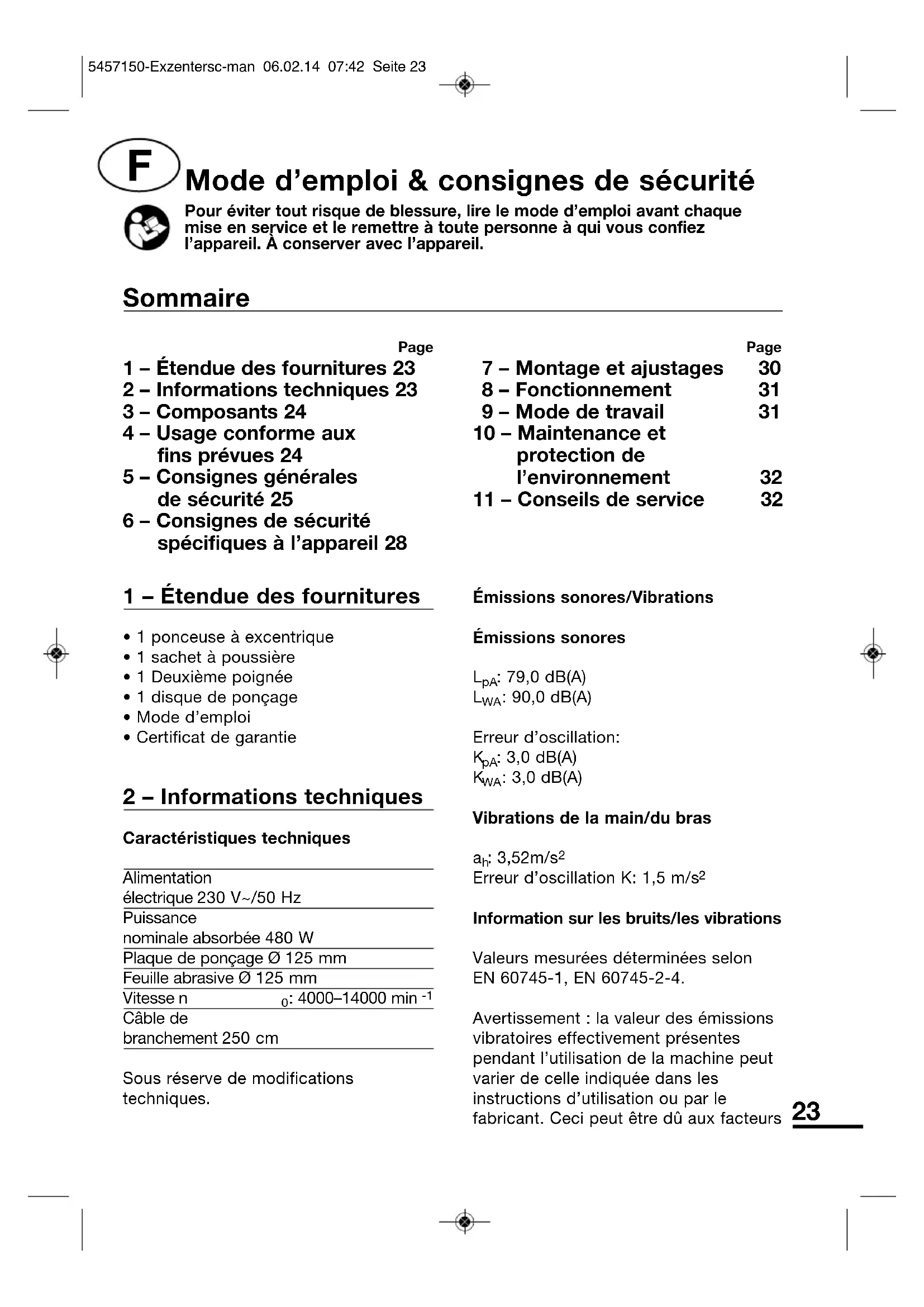 Page 1 – Étendue des fournitures 23 2 – Informations techniques 23 3 – Composants 24 4 – Usage conforme aux fins prévues 24 5 – Consignes générales de sécurité 25 6 – Consignes de sécurité spécifiques à l’appareil 28 Page 7 – Montage et ajustages 30 8 – Fonctionnement 31 9 – Mode de travail 31 10 – Maintenance et protection de l’environnement 32 11 – Conseils de service 32 Sommaire 5457150-Exzentersc-man 06.02.14 07:42 Seite 2324 d’influence suivants qu’il faut prendre en considération avant ou pendant chaque utilisation :