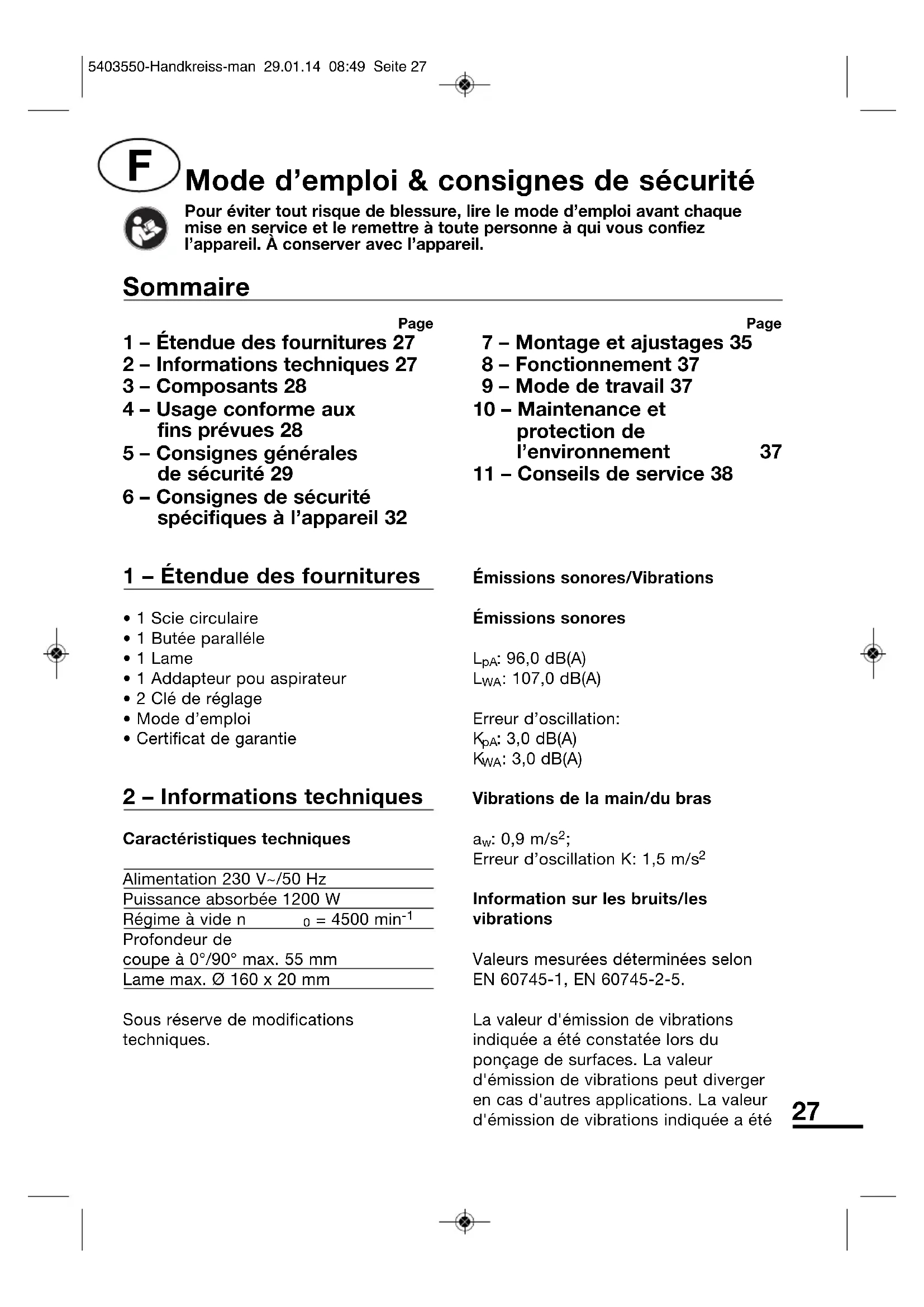 Page 1 – Étendue des fournitures 27 2 – Informations techniques 27 3 – Composants 28 4 – Usage conforme aux fins prévues 28 5 – Consignes générales de sécurité 29 6 – Consignes de sécurité spécifiques à l’appareil 32 Page 7 – Montage et ajustages 35 8 – Fonctionnement 37 9 – Mode de travail 37 10 – Maintenance et protection de l’environnement 37 11 – Conseils de service 38 Sommaire 5403550-Handkreiss-man 29.01.14 08:49 Seite 2728 mesurée selon un procédé d'essai normé et peut être utilisée pour une comparaison d'un outil électrique avec un autre. La valeur d'émission de vibrations indiquée peut également être utilisée pour une première estimation de la nuisance. ATTENTION! La valeur d'émission de vibrations peut diverger de la valeur indiquée pendant l'utilisation de l'outil électrique, selon la manière dont l'outil électrique est utilisé. Des mesures de sécurité doivent être prises pour la protection de l'utilisateur. Ici, l'estimation de la nuisance se fait sous prise en considération des conditions d'utilisation réelles. (Toutes les parts du cycle de fonctionnement doivent être prises en considération, c'est-à- dire également les temps durant lesquels l'outil est hors service et ceux durant lesquels il est certes en service mais sans être sollicité). ATTENTION! Une certaine nuisance sonore causée par l'appareil est inévitable. Effectuez donc les travaux bruyants aux heures autorisées et fixées à cette fin. Respectez le cas échéant les périodes de repos et limitez la durée de travail au strict nécessaire. ATTENTION! Le bruit peut être responsable de lésions de l'ouïe. Une protection de l'ouïe est donc indispensable pour travailler. Les personnes se trouvant à proximité devraient également porter une protection de l'ouïe adéquate. 3 – Composants 1 Poignée 2 Commutateur 3 Vis d` arrét 4 Coin de fente 5 Gaine antipompage 6 Vis â six pans 7 Coussinet de la scie 8 Bride 9 Butée paralléle 10 Raccord aspirateur 11 Réglage de l’angle de coupe 12 Réglage de la profondeur de coupe 13 Addapteur pou aspirateur 4 – Usage conforme aux fins prévues Cette scie circulaire à main ne peut être utilisée qu’en service commandé à la main. Cette scie circulaire est appropriée aux coupes droites dans le bois et les matériaux agglomérés avec la lame d`origine conformément aux instructions de ce manuel. Avec des lames appropriées (respecter les instructions des constructeurs !), cette machine est également adaptée â la coupe des matériaux suivants: plastiques, duroplastiques et thermoplastiques, matériaux laminaires, panneaux expansées dures, carlon-plâtres, panneaux en laine de pierre, panneaux composites ciment, béton expansé ainsi que métaux non ferreux. Tout les autres utilisations sont explicitement exclues. Cet appareil n’est pas prévu pour être utilisé par des personnes (enfants compris) présentant des capacités physiques, sensorielles ou mentales limitées ou manquant d’expérience et/ou de connaissances à moins que ces personnes ne soient surveillées par une personne responsable de leur 5403550-Handkreiss-man 29.01.14 08:49 Seite 2829 sécurité ou qu’elles n’aient obtenu de sa part des instructions d’utilisation. Nous vous conseillons de surveiller les enfants afin de veiller à ce qu'ils ne jouent pas avec l'appareil. Cet appareil est uniquement destiné à un usage dans le domaine domestique. Utilisation non conforme aux fins prévues Toutes les utilisations de l'appareil qui ne sont pas indiquées dans le chapitre « Utilisation conforme aux fins prévues » sont considérées comme des utilisations non conformes. Les applications pour lesquelles l'outil électrique n'est pas prévu peuvent être sources de dangers et occasionner des blessures. N'utilisez aucun accessoire qui n'est pas spécialement prévu pour cet outil électrique. Il y a risque de blessures. L'utilisateur de l'appareil est responsable de tous les dommages matériels et corporels résultant d'une fausse utilisation. La garantie du fabricant expire en cas d'utilisation d'autres composants ou de composants autres que ceux d'origine sur la machine. Risques restants: Le mode d'emploi qui accompagne cet outil électrique contient des remarques détaillées sur le fonctionnement sûr des appareils électriques. Néanmoins, chaque outil électrique cache certains risques restants, qui ne peuvent pas être complètement exclus par les dispositifs de protection en place. N'utilisez donc des outils électriques qu'avec le soin qui s'impose. Les risques restants peuvent par exemple émaner de ce qui suit: