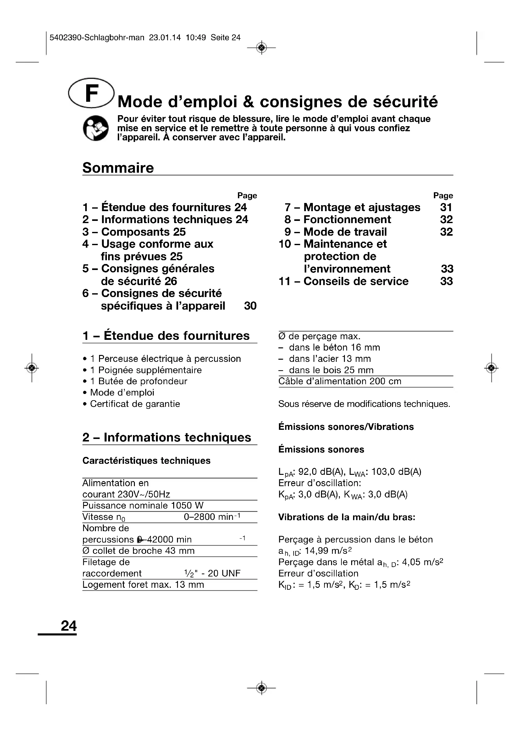 Page 1 – Étendue des fournitures 24 2 – Informations techniques 24 3 – Composants 25 4 – Usage conforme aux fins prévues 25 5 – Consignes générales de sécurité 26 6 – Consignes de sécurité spécifiques à l’appareil 30 Page 7 – Montage et ajustages 31 8 – Fonctionnement 32 9 – Mode de travail 32 10 – Maintenance et protection de l’environnement 33 11 – Conseils de service 33 Sommaire